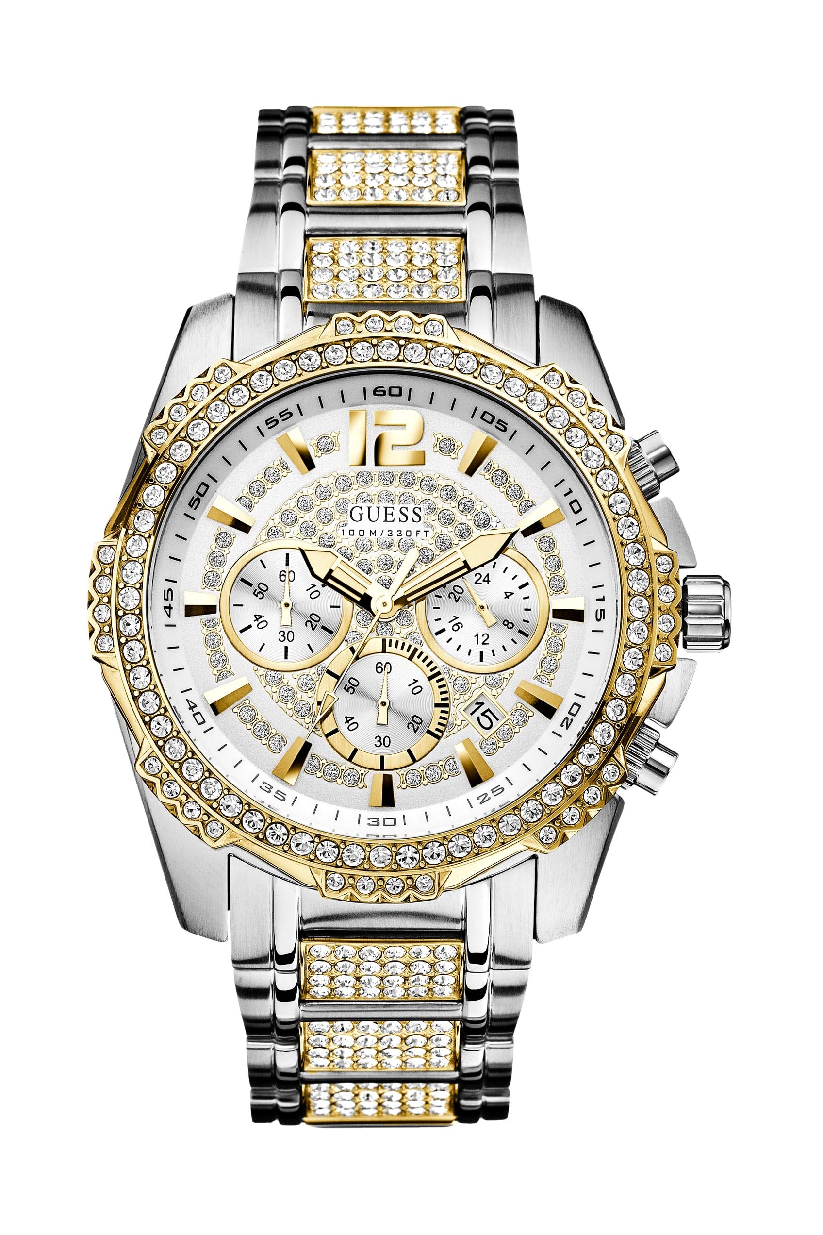 This Guess watch has a round white dial with an analog display and a sturdy stainless steel case in silver or gold tone. With a 100 M water resistance and a chronograph feature, this versatile watch is ideal for any casual event. The 45 mm dial and 12 mm case thickness provide a sleek and modern look, while the 24 mm metal band adds a touch of elegance. This single pack set has a 1-year warranty and is powered by a dependable quartz movement. To keep it looking its best, use a cotton cloth to clean the dial.