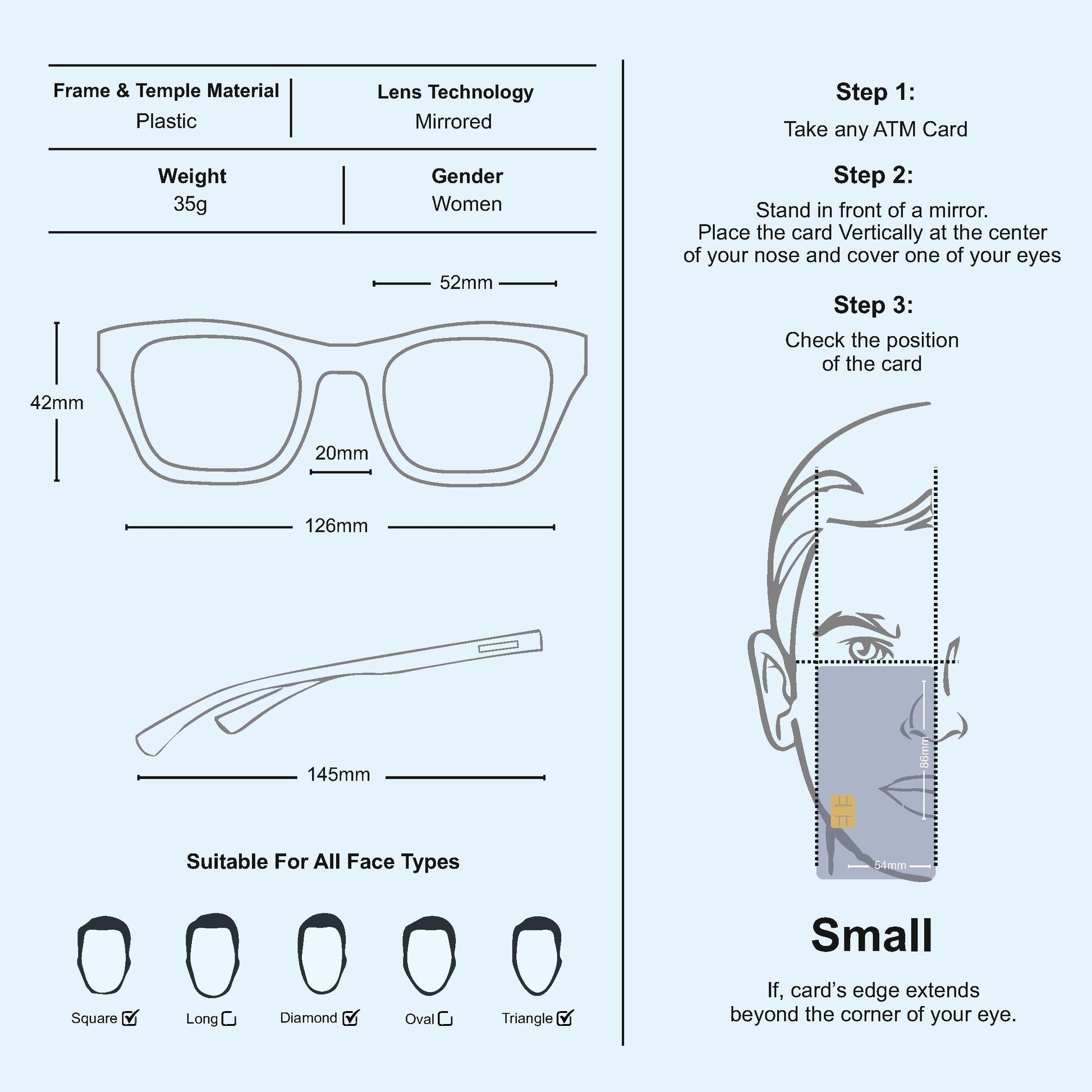 - Frame size: Lens width - 52 mm, nose-bridge: 20 mm, temple length: 145 mm
