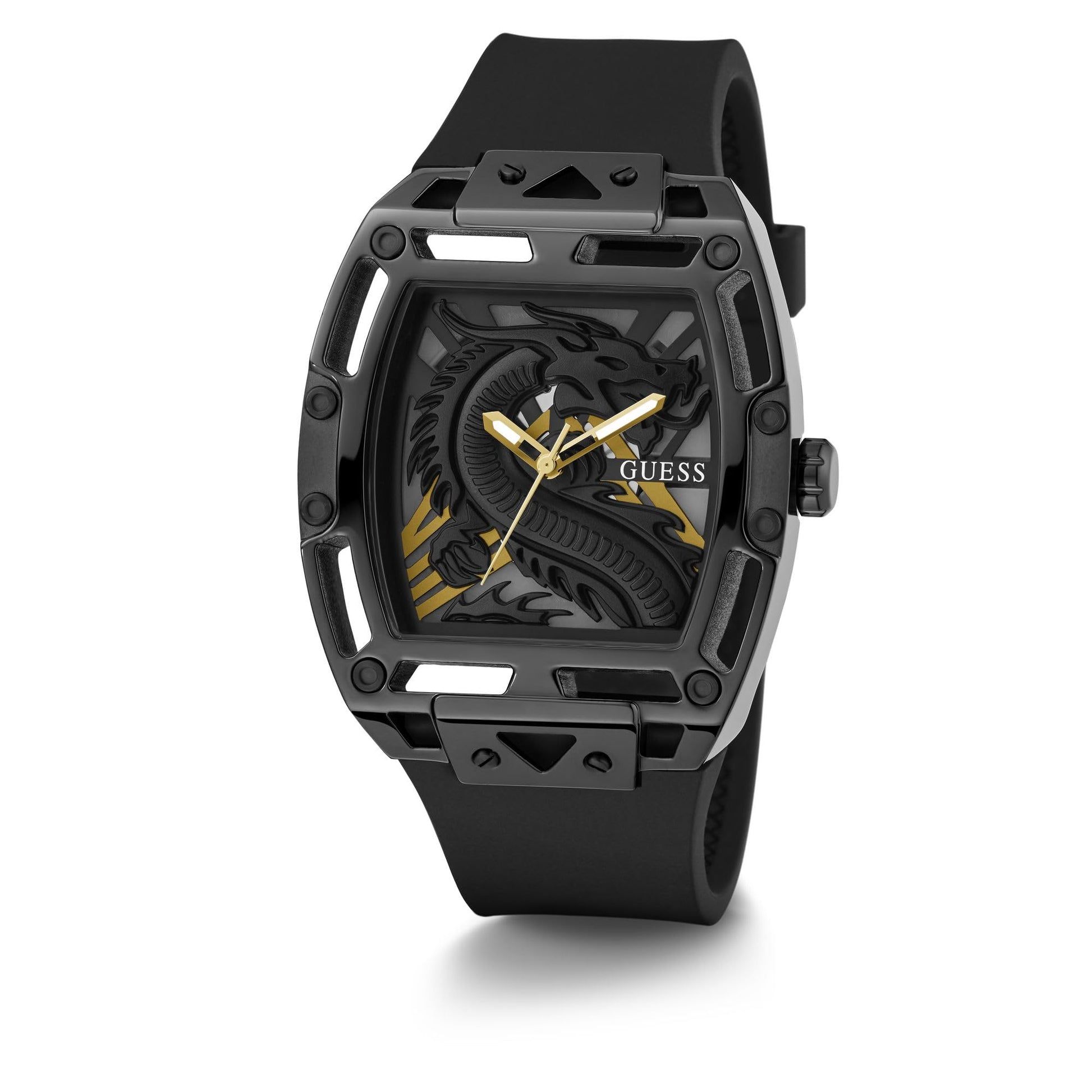 GUESS Silicone Men 44Mm Analog Watch - Black Strap Black Dial Black Case, Black/Black/Gold, Classic, Black Band