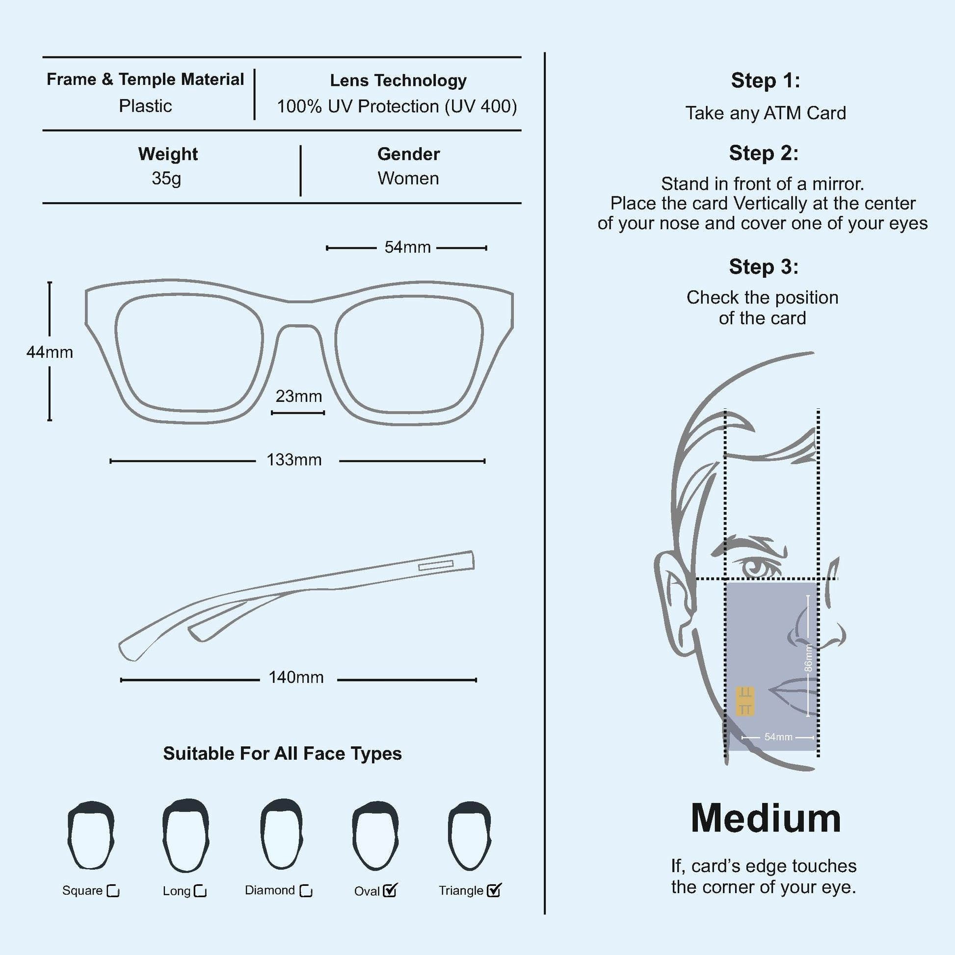 - Frame size: Lens width - 54 mm, nose-bridge: 23 mm, temple length: 140 mm