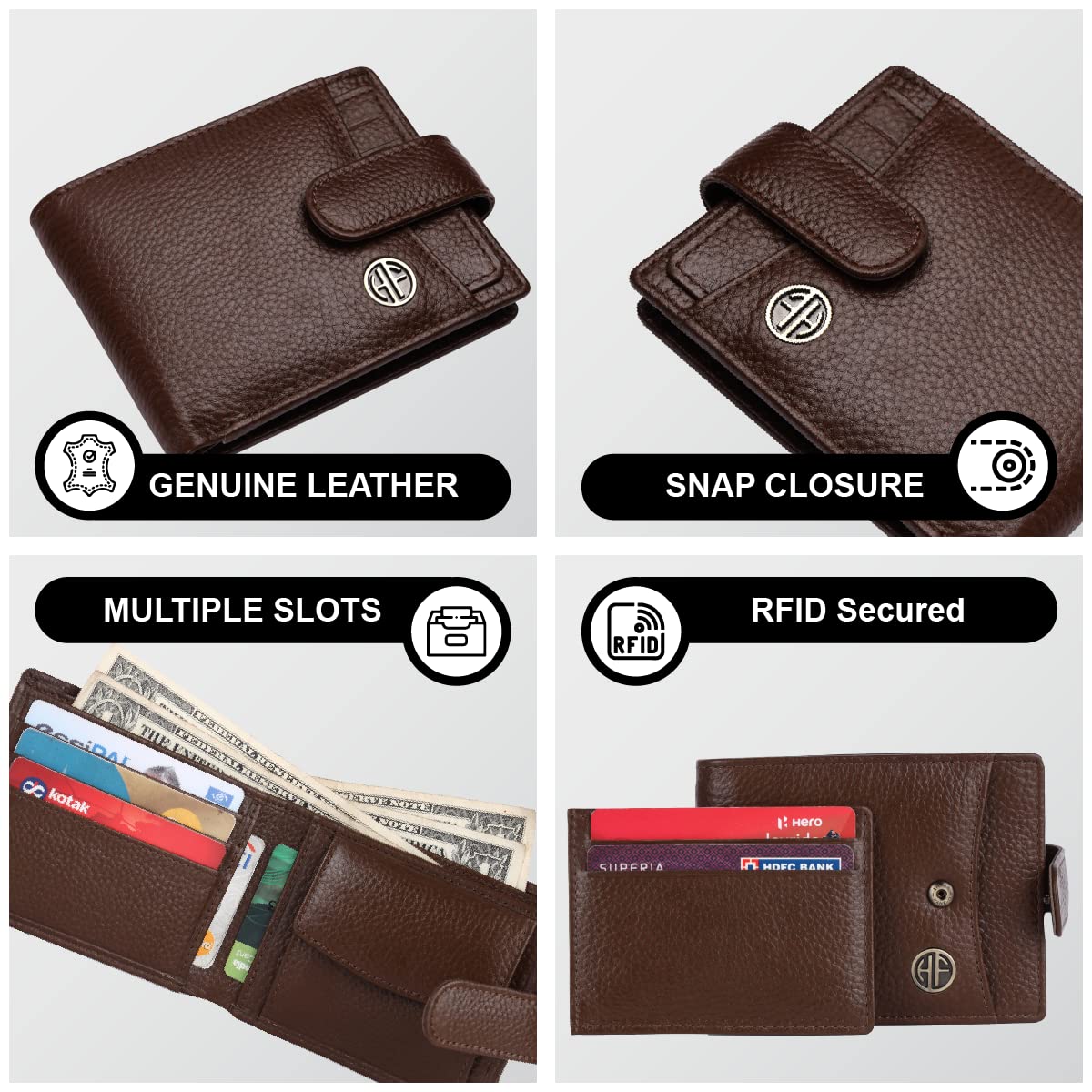HAMMONDS FLYCATCHER Genuine Leather Wallet for Men - RFID Protected Leather Purse for Men, Money Purse for Men - 5 Card Slots, Coin Pocket, Hidden Pockets, Metal Snap Button - Brushwood