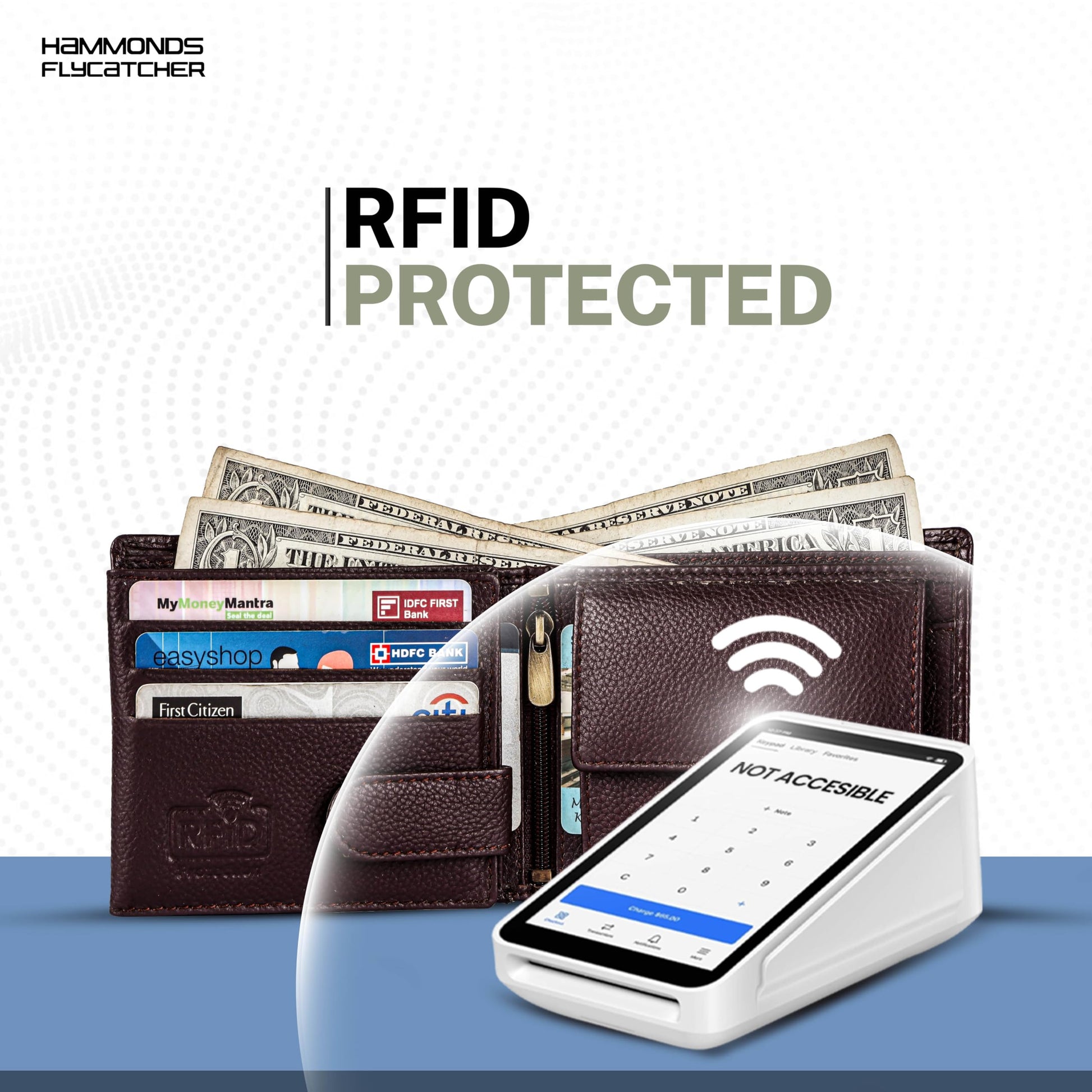 Elevate your style and functionality with the HAMMONDS FLYCATCHER Genuine Leather Wallet for Men. This expertly crafted wallet is designed to meet the needs of modern men who value quality, convenience, and security. Made from premium genuine leather, this wallet combines durability with a sophisticated appearance, making it an essential accessory for any gentleman. Our mens purse wallet leather is crafted from high-quality genuine leather, offering both durability and a luxurious feel. The sleek design ensures that this wallet men can easily fit into any pocket, making it the ideal pocket purse for men. Measuring 11cm (Length) x 2cm (Width) x 9cm (Height), this wallet is compact yet offers ample storage space. It features 6 card slots, 3 transparent ID slots, 2 hidden pockets, 1 coin pocket, 1 zipper pocket and 2 currency slots. This makes it a practical wallet with card holder for men, providing organized storage for your cards, cash, and coins. The bi-fold design ensures everything is neatly arranged and easily accessible. Safety is a priority with the HAMMONDS FLYCATCHER wallet. It comes with integrated RFID blocking technology, protecting your sensitive information from electronic theft. The sturdy metal snap button ensures that your valuables stay secure, providing peace of mind whether you're traveling or going about your daily routine. This versatile man wallet is suitable for various occasions. It also makes a great valet for men who appreciate high-quality accessories. Its timeless design and functionality make it a perfect man purse for any discerning gentleman. The HAMMONDS FLYCATCHER wallet is not just for men; it's also an excellent choice for boys wallet. Its stylish design and practical features make it a great purse for boys, ensuring they have a reliable and fashionable accessory. It is also ideal as a gift for young adults or anyone looking for a quality gents wallets.