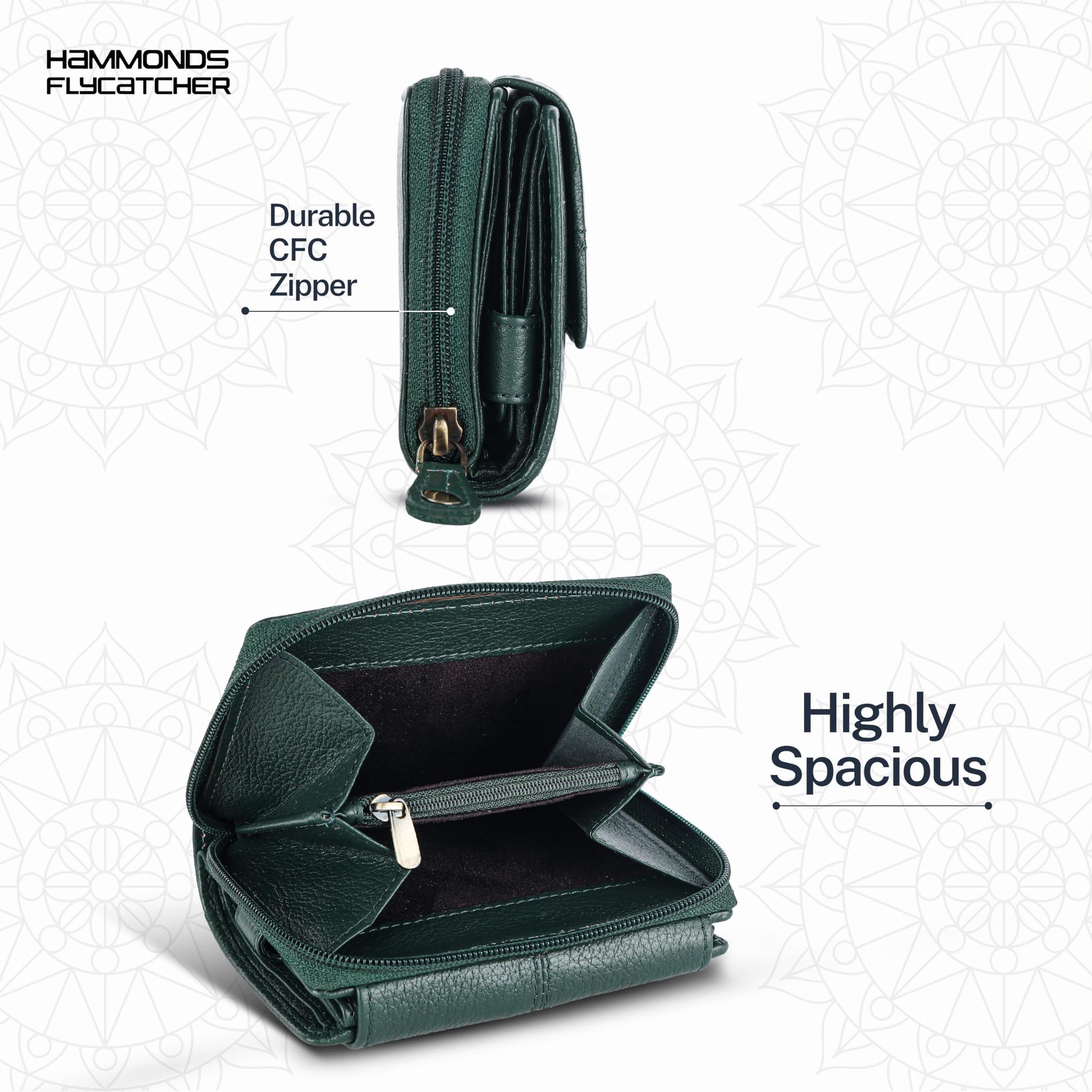 HAMMONDS FLYCATCHER wallet for women - Genuine Leather Ladies Wallet - Green - 14 Card Slots - RFID Protection - 3 ID Card Slots - Women's Wallet - Button Closure -Hand Wallet - Daily Use, Money Purse