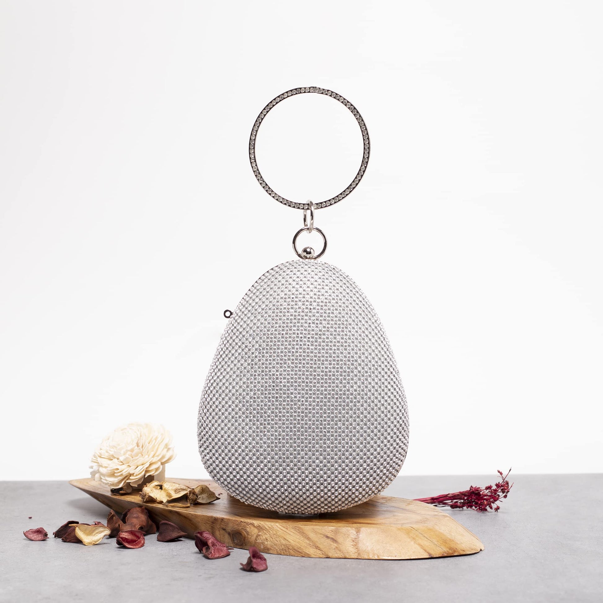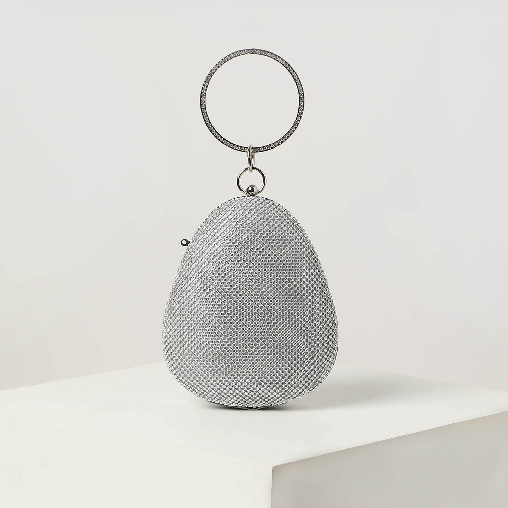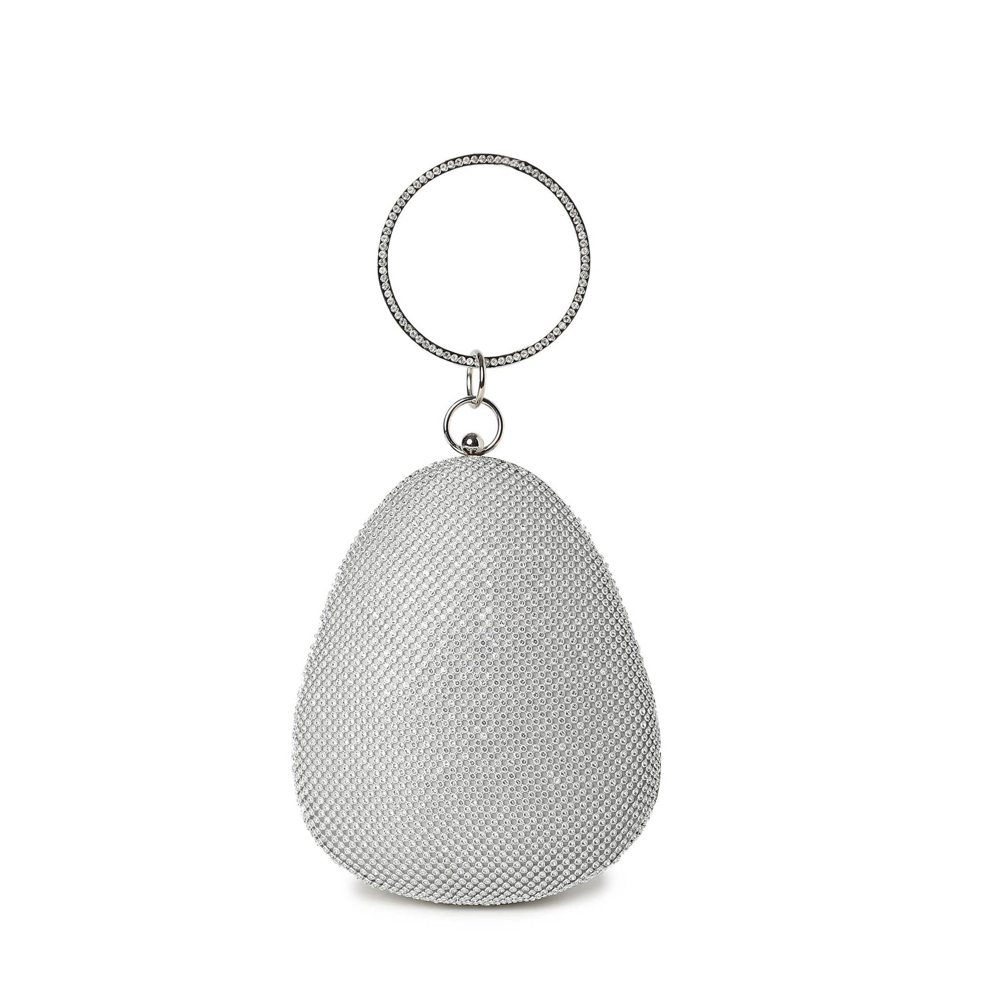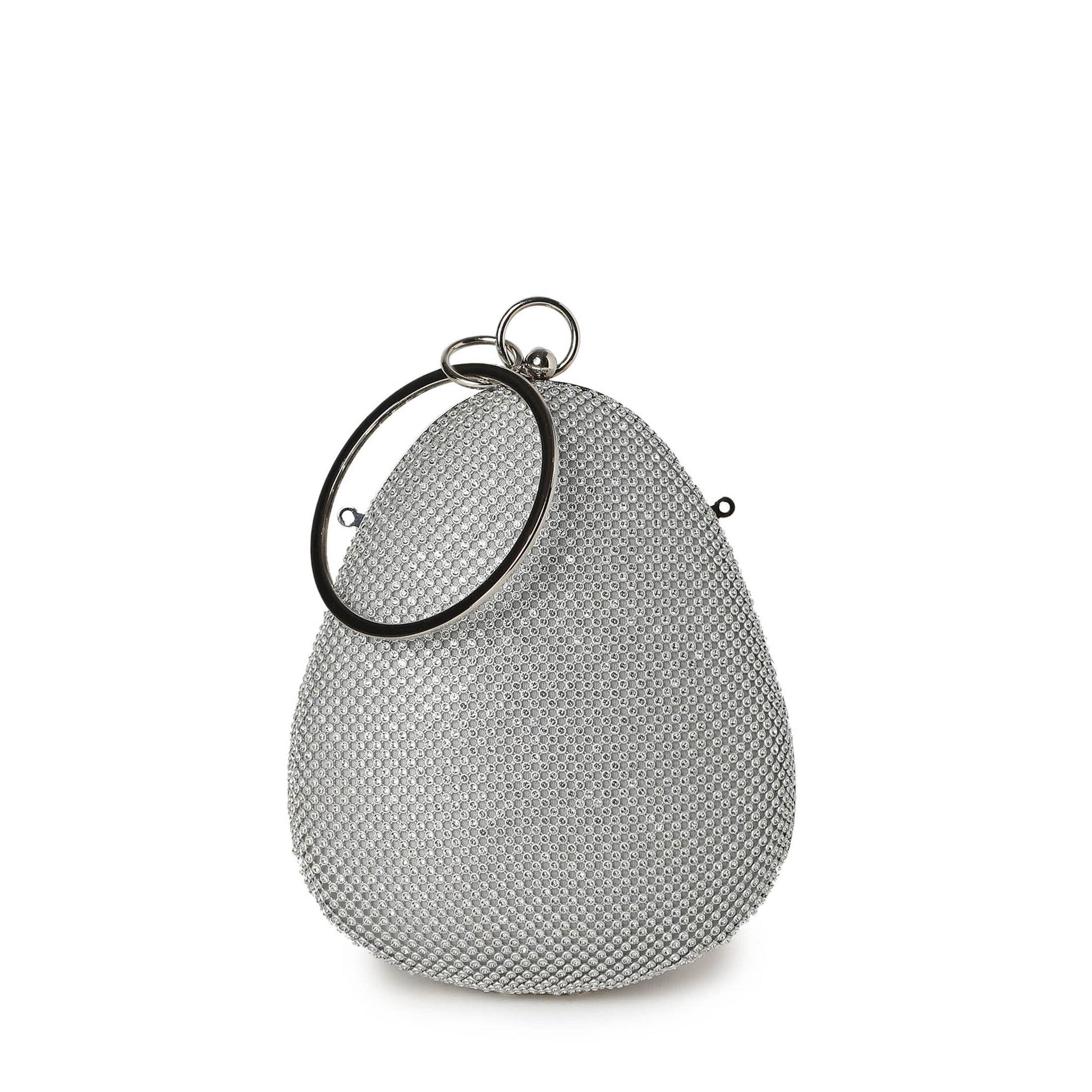 - ❤️SPECIFICATIONS: Clutch bag comes in an oval shape with rhinestones over a silver base, Push closure for its compartment. Comes with a detachable chain and a circular metallic handle.