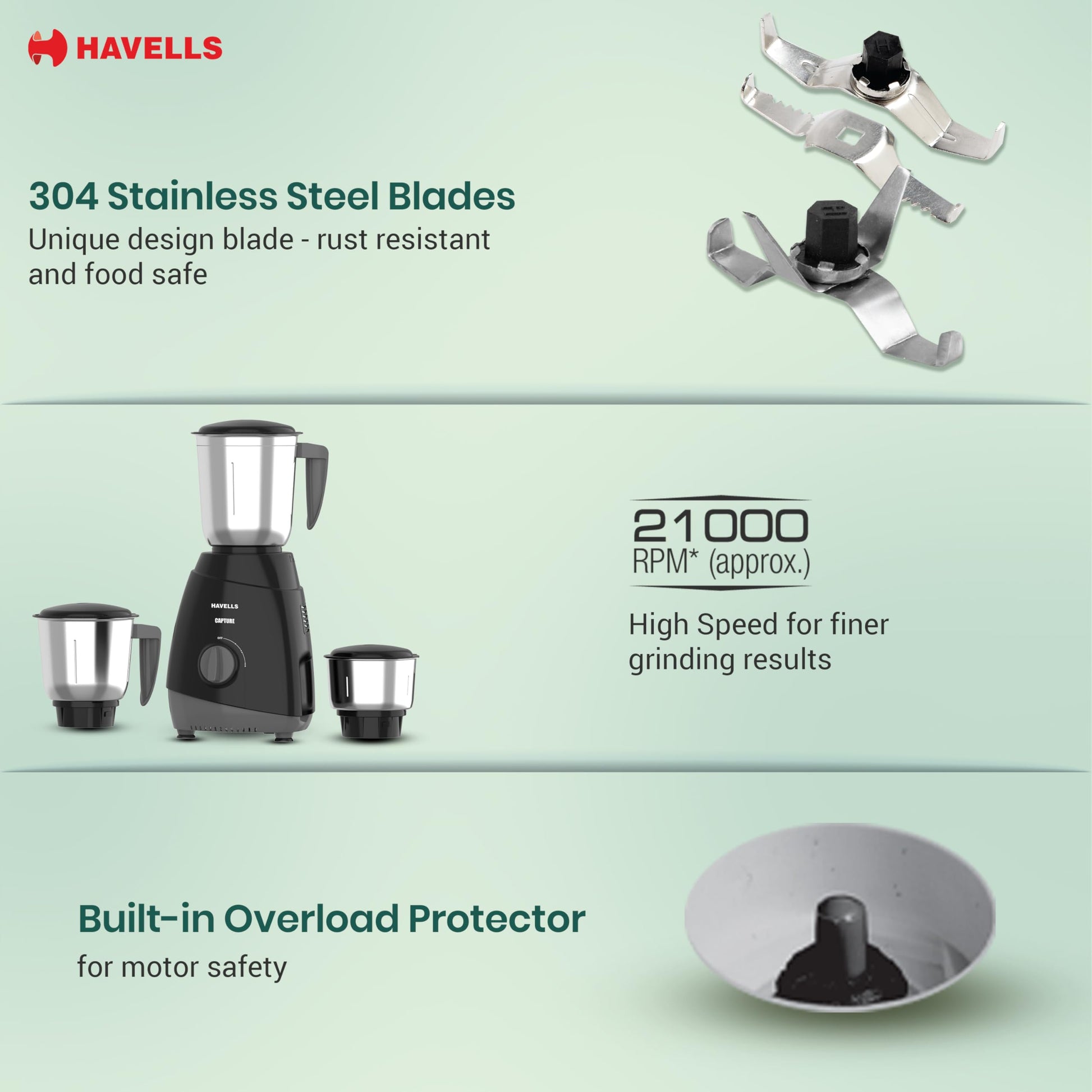 Havells Capture 500W Mixer Grinder 3 Stainless Steel Jars | 21000 RPM High-Speed Motor | Rust-Resistant 304 SS Blades | 1.5L Large Blending Jar | Overheat Protection | 1-Year Warranty (Black)