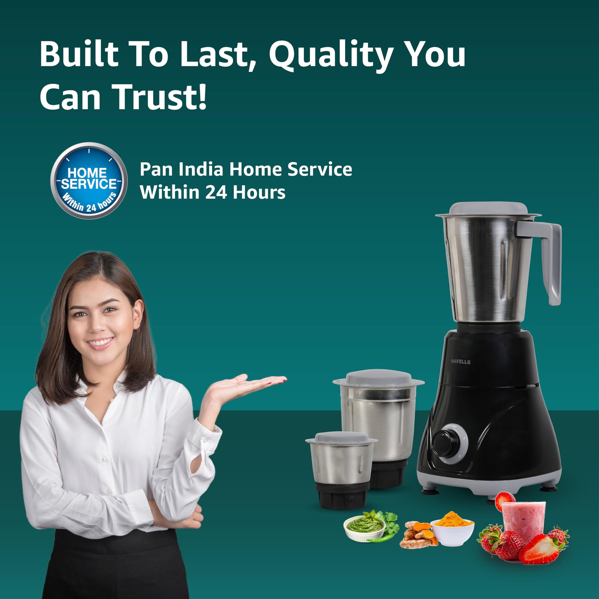 Havells Pulse 500 Watt Mixer Grinder | 3 Stainless Steel Leak-Resistant Jars (400ml, 800ml, 1.2L) | 3 Speed Control | Heavy-Duty ABS Body | Durable SS Blades | Air Vent Technology | Black