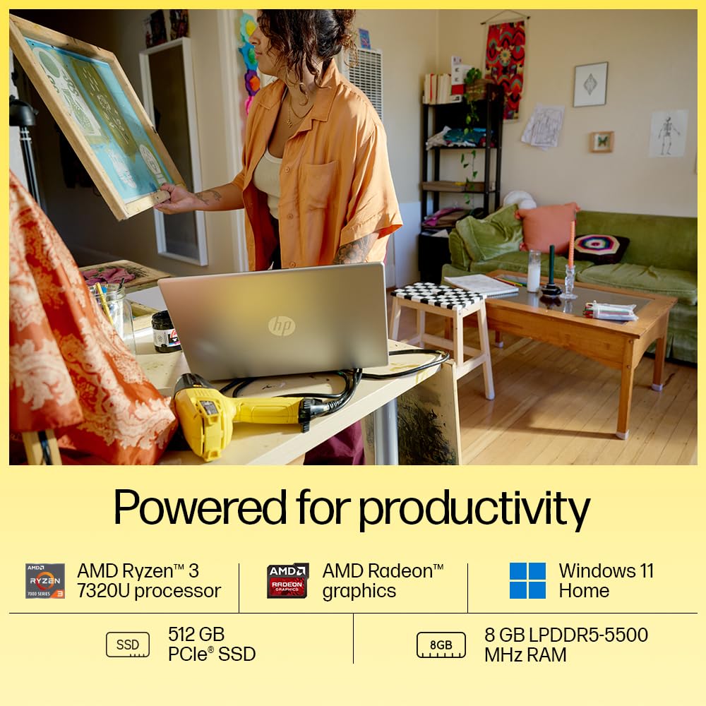 - Processor : AMD Ryzen 3 7320U (up to 4.1 GHz max boost clock, 4 MB L3 cache, 4cores, 8 threads)| Storage & Memory : 8 GB LPDDR5-5500 MHz RAM , 512 GB PCIe NVMe M.2 SSD