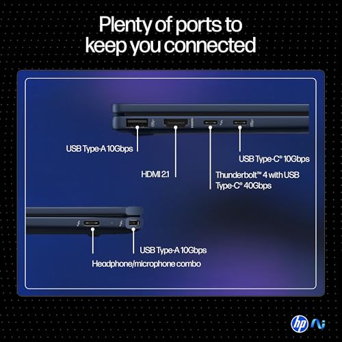 - Ports & Connectivity : 2 USB Type-A 10Gbps signaling rate; 1 HDMI 2.1; 1 headphone/microphone combo; 1 Thunderbolt 4 with USB Type-C 40Gbps signaling rate (USB Power Delivery, DisplayPort 2.1, HP Sleep and Charge); 1 USB Type-C 10Gbps signaling rate (USB Power Delivery, DisplayPort 1.4a, HP Sleep and Charge)| Connectivity: Intel Wi-Fi 7 BE201 (2x2) and Bluetooth 5.4 wireless card