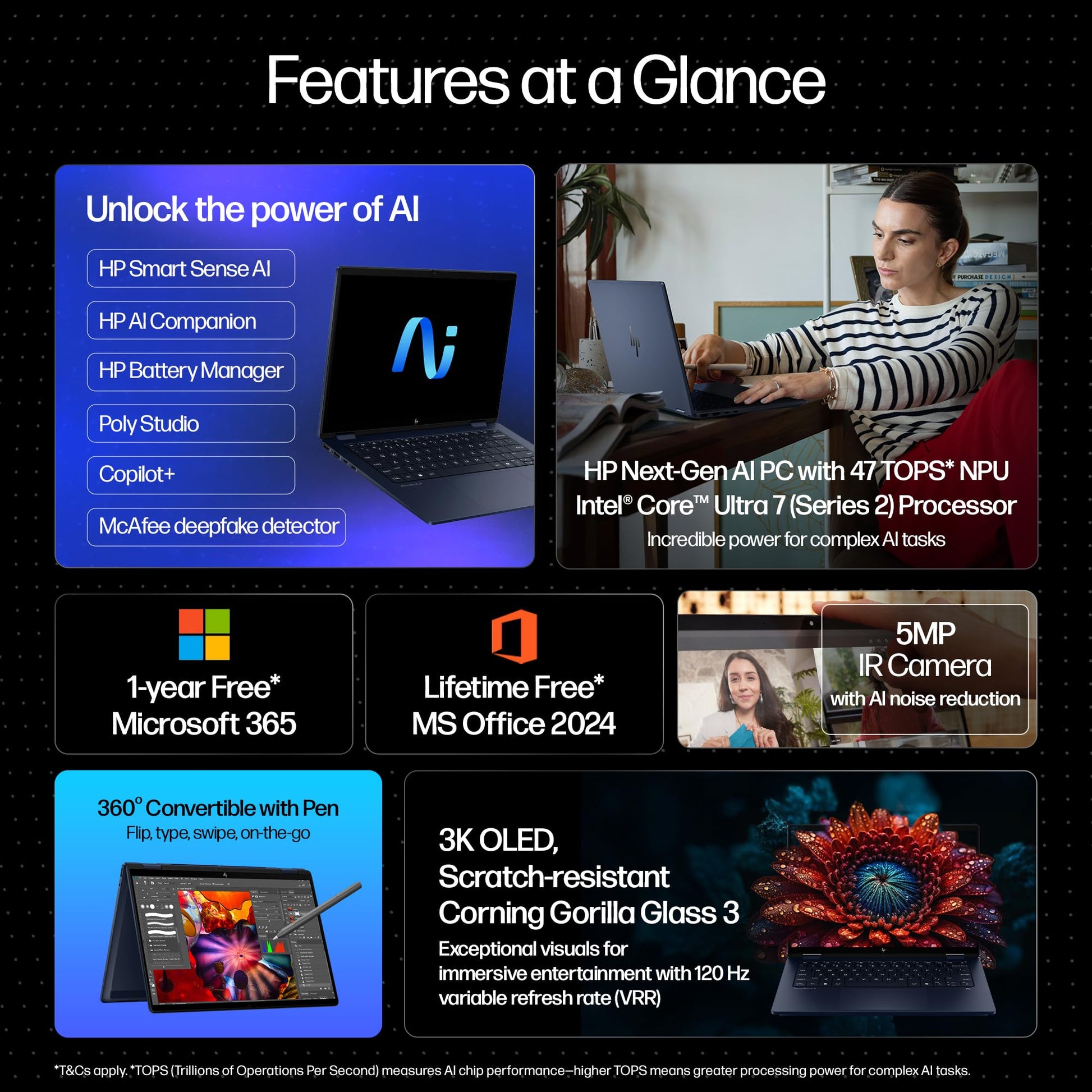 HP OmniBook X Flip (Previously Envy), Intel Core Ultra 7 258V Next Gen AI Laptop, 47 Tops (32GB LPDDR5X, 1TB SSD) 3K,OLED, 0.2ms,14''/35.6cm Touch, Win11, Office24, Blue, 1.38kg, 5MP Camera, fm0029TU