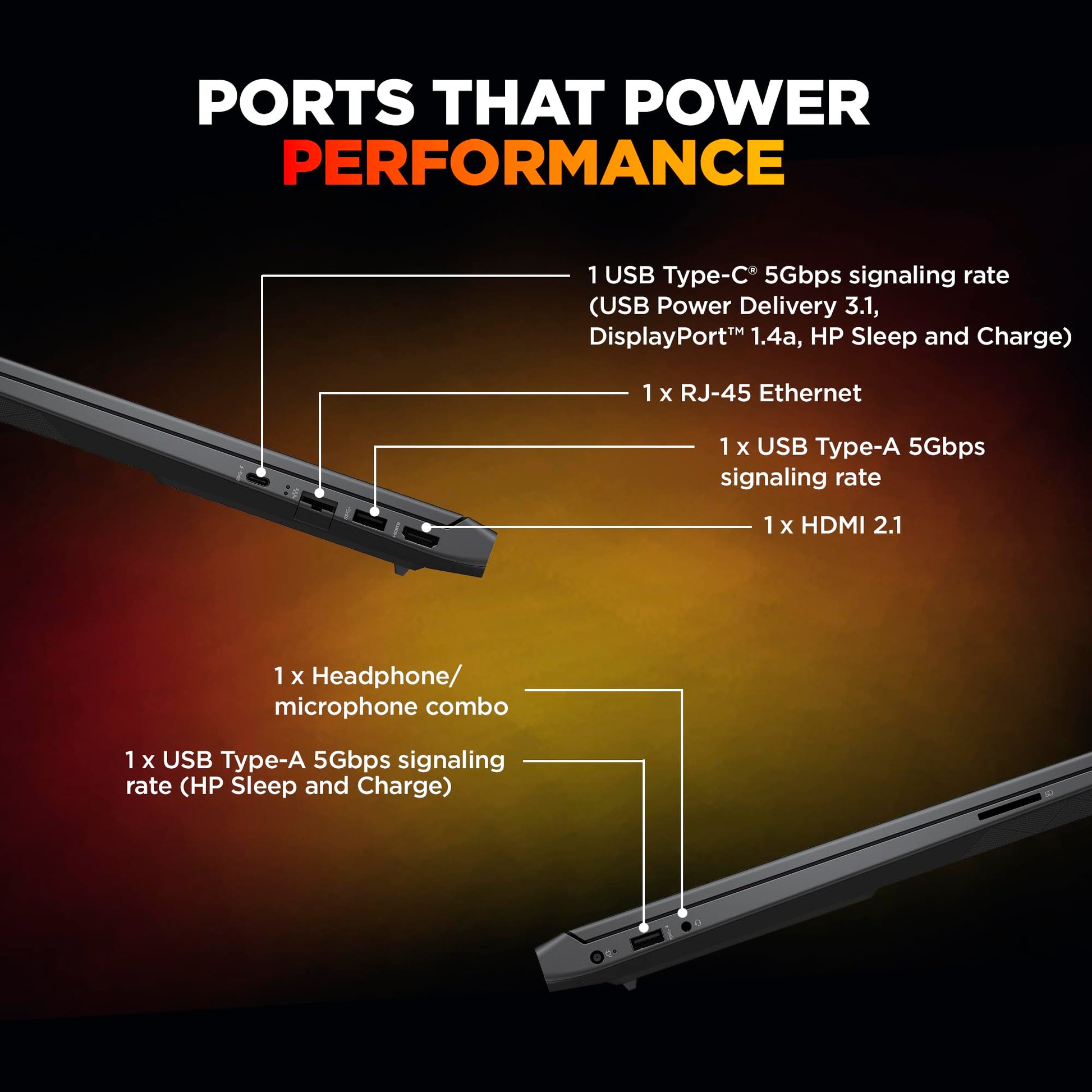- Ports & Connectivity :1 USB Type-A 5Gbps signaling rate (HP Sleep and Charge); 1 USB Type-A 5Gbps signaling rate; 1 AC smart pin; 1 HDMI 2.1; 1 headphone/microphone combo; 1 RJ-45; 1 USB Type-C 5Gbps signaling rate (USB Power Delivery 3.1, DisplayPort 1.4a, HP Sleep and Charge)| Wireless: Realtek Wi-Fi 6 (2x2) and Bluetooth 5.4 wireless card