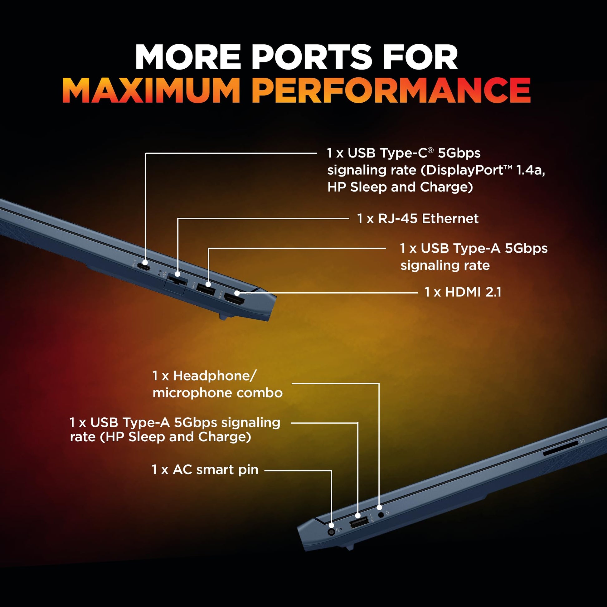- Ports & Connectivity : 1 USB Type-A 5Gbps signaling rate (HP Sleep and Charge); 1 USB Type-A 5Gbps signaling rate; 1 AC smart pin; 1 HDMI-out 2.1; 1 headphone/microphone combo; 1 RJ-45; 1 USB Type-C 5Gbps signaling rate (USB Power Delivery 3.1, DisplayPort 1.4a, HP Sleep and Charge)|