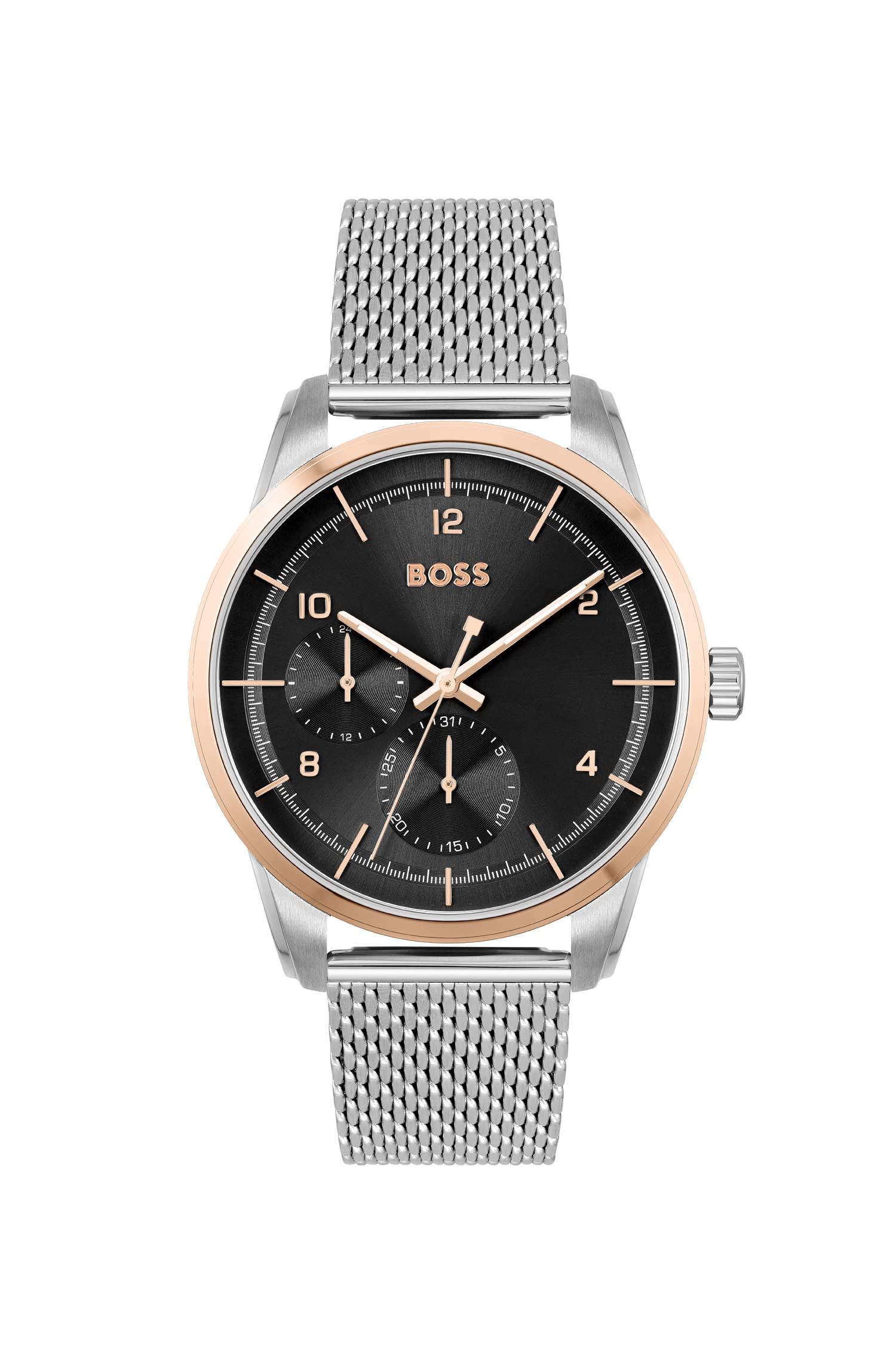 A creatively styled watch by HUGO. This progressive watch is engineered in black steel with modern subeyes, a HUGO logo in signature red and a mesh bracelet with a branded clasp. Add a directional touch to an everyday look with this accessory.