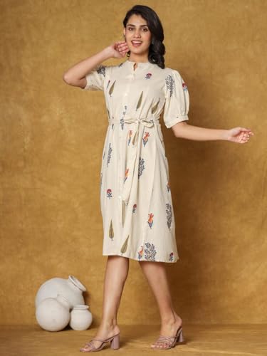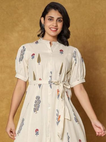 INDO ERA Women's A-Line Cotton Printed Floral Dress (White_IEOUT10068_Medium)