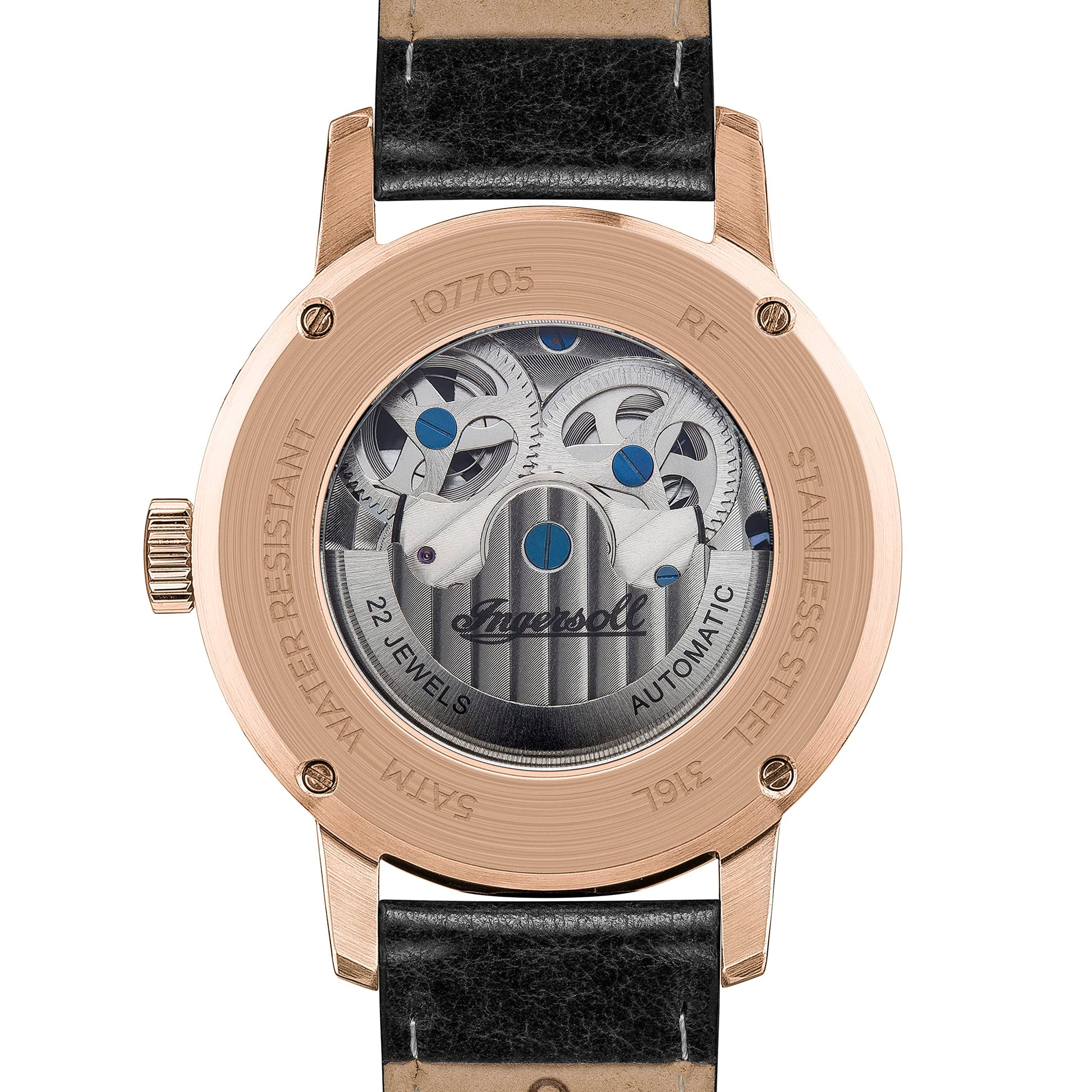 Classic Ingersoll Mens watch I07705. Colors > Dial: Black, Silver, Bracelet: Black, Case: Rosé gold. Very comfortable Calf leather strap. The water resistance is 5 ATM. A scratch proove hardened, Mineral glass protects you watch from involuntary injuries.