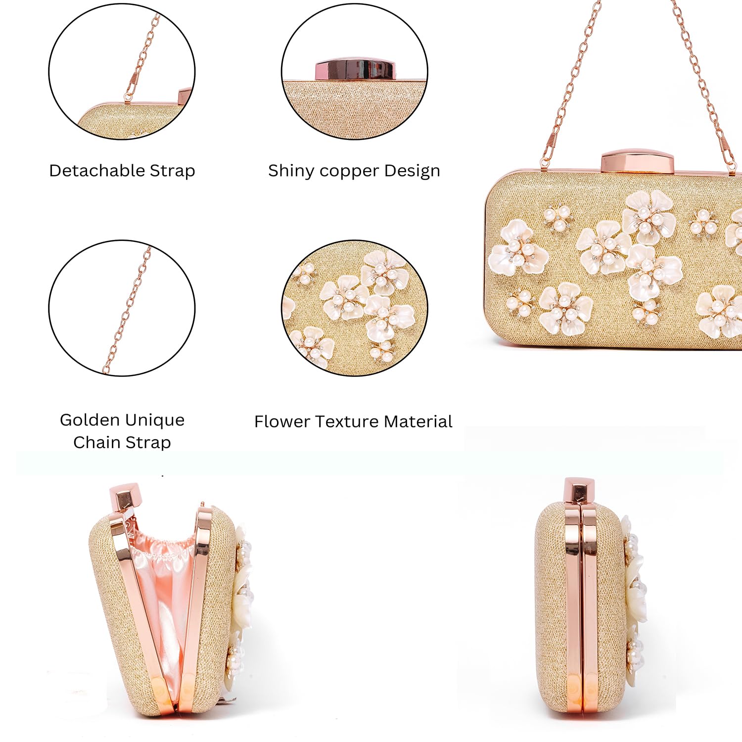 INOVERA (LABEL) Women's Glitter Floral Rhinestone Beaded Evening Party Clutch Wedding Bag Wallet (Rose Gold)