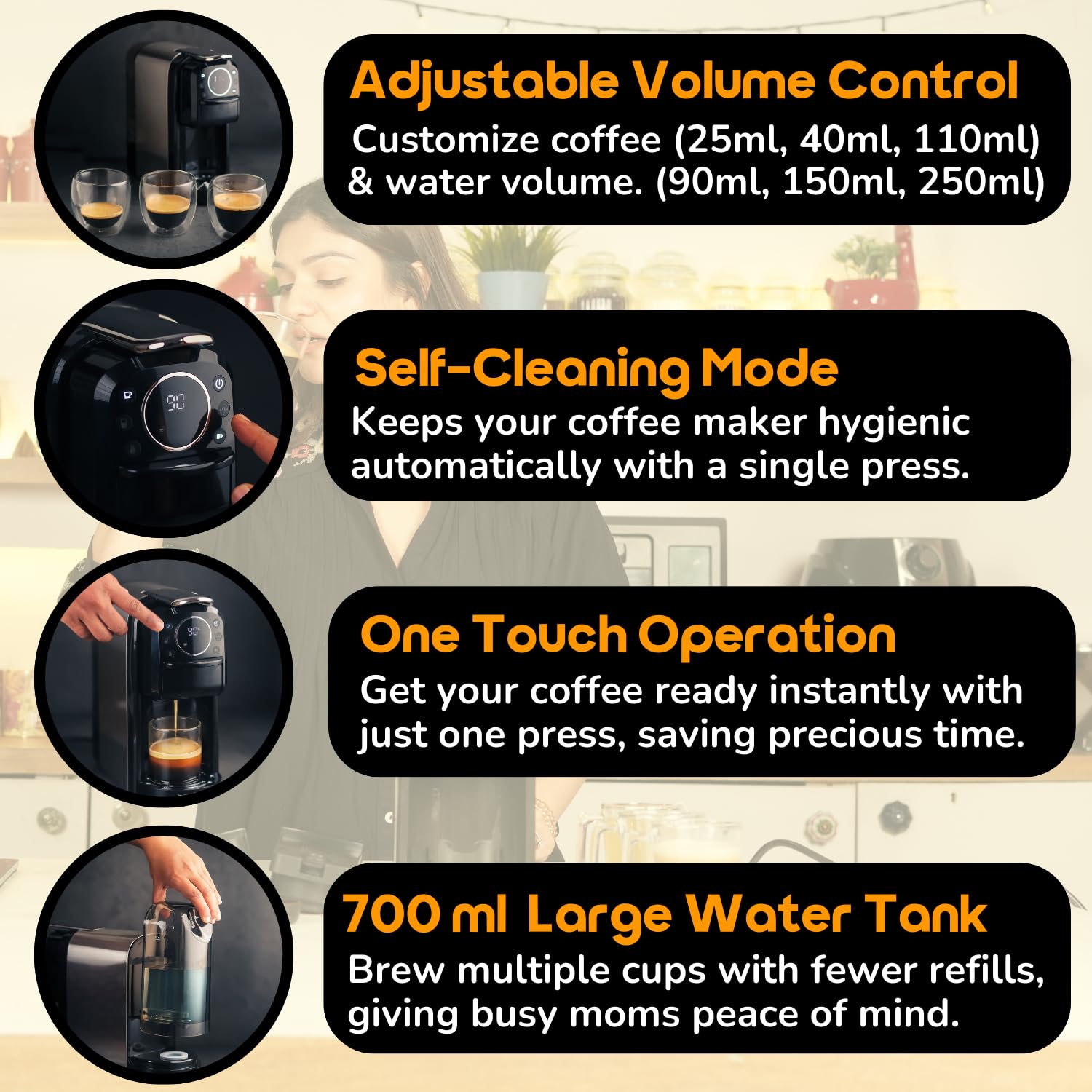 - LED Touch Screen with 3 Cup Sizes for Customization - Whether you need a quick espresso (25ml), a balanced mid-size cup (40ml), or a large coffee (110ml), the LED touch panel makes selection easy and precise. The cup size can be selected based on your preference, and the adjustable cup tray can be modified as per the mug height to ensure a spill-free experience, even with your favorite travel mug!