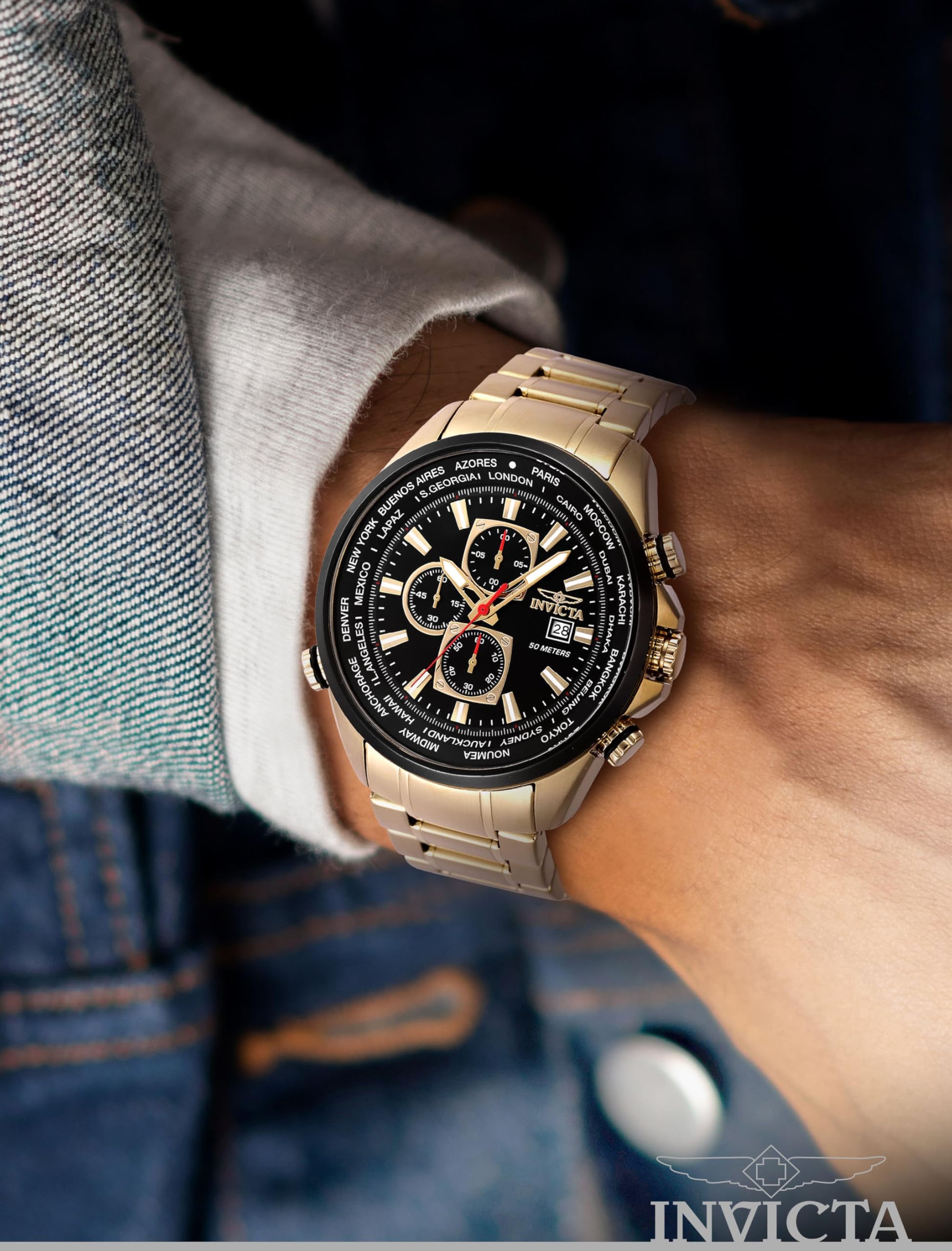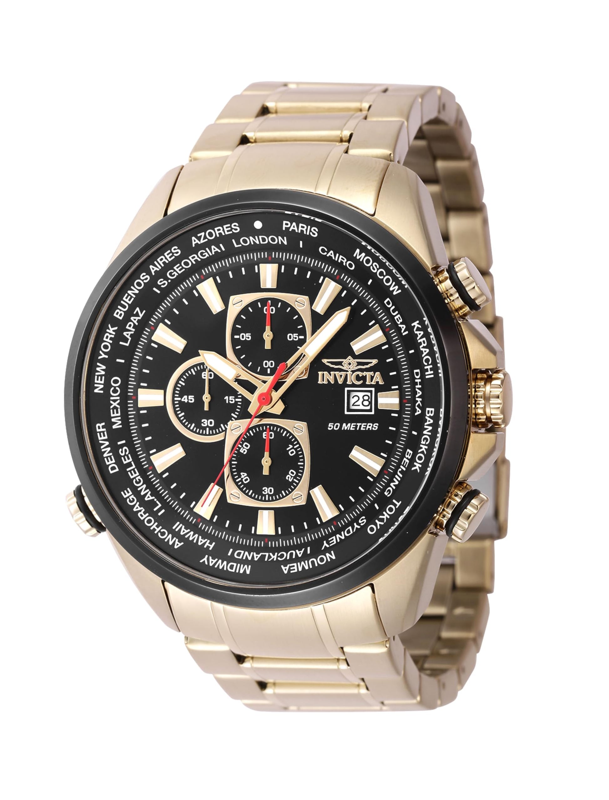 The INVICTA 47819 model is part of the Aviator collection; this watch comes with a 50 mm Gold, Black case, Black dial protected by Mineral crystal, powered by a Quartz movement completed by a Stainless Steel band. Water resistant up to 50 meters, protected by Invicta 2-year warranty