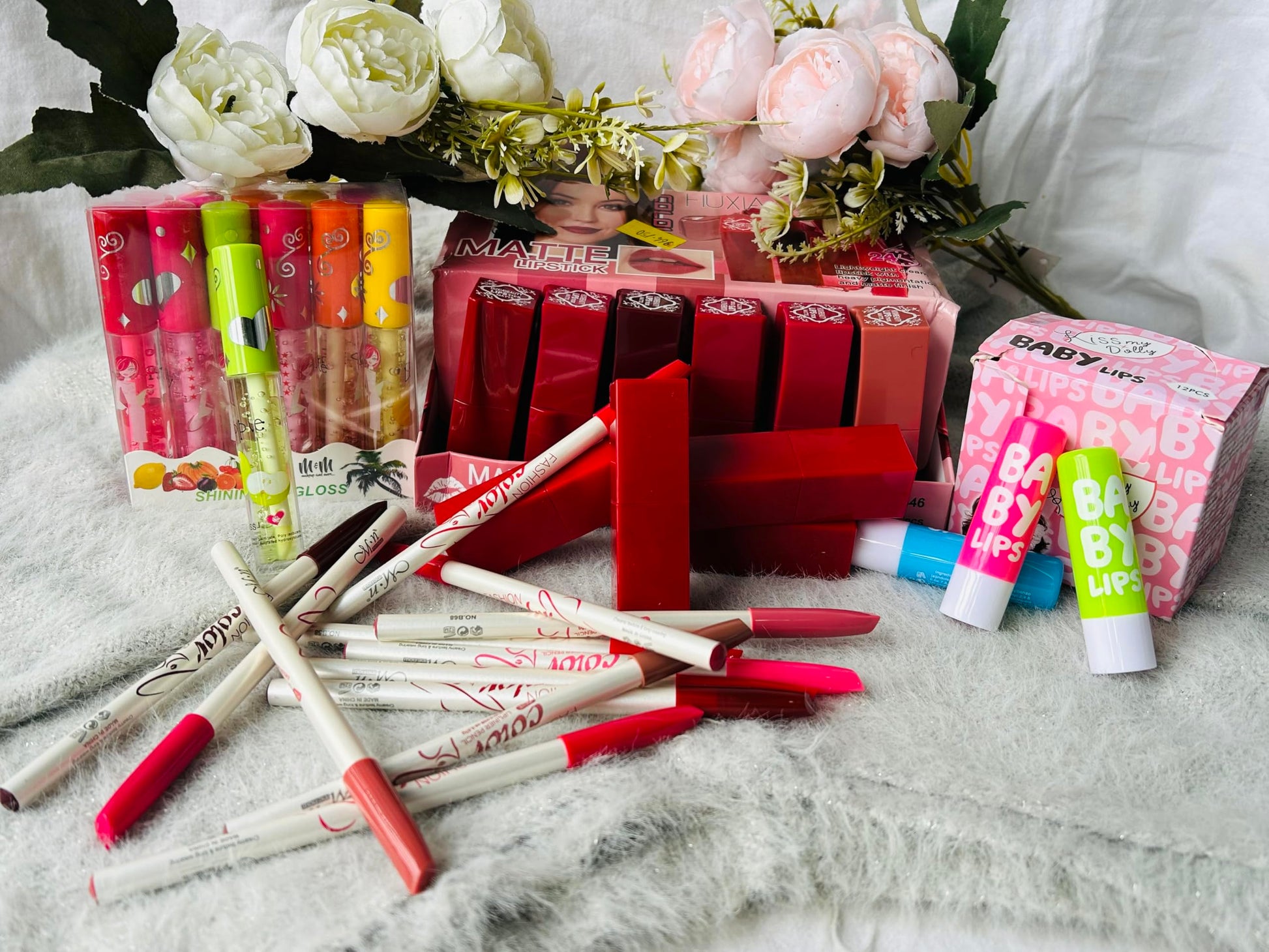 - COMPLETE SET: Features matte lipsticks, bubble glosses, and baby lips balms in an attractive display with decorative floral accents