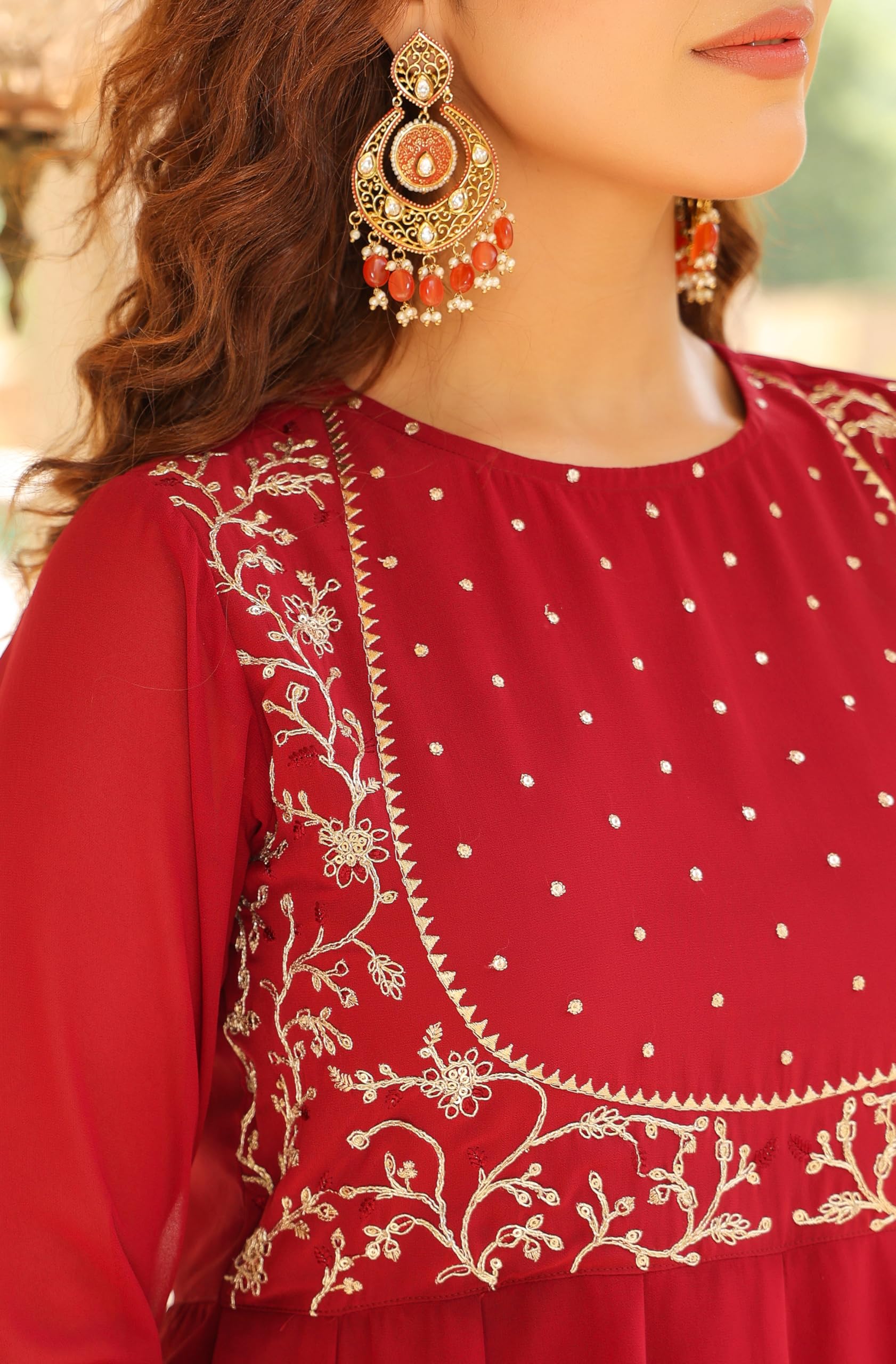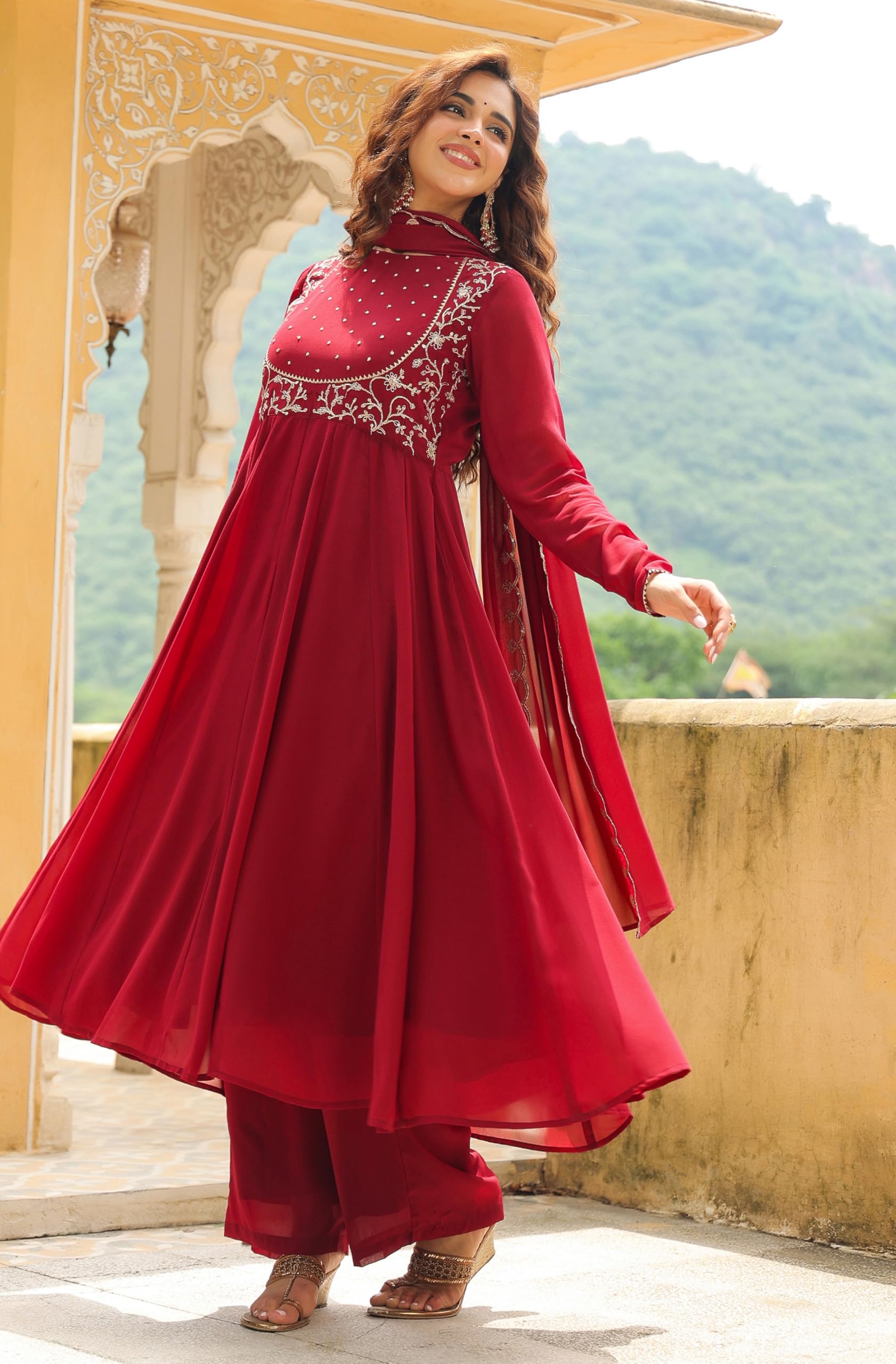 Festive wear just got better with Janasya’s Maroon Georgette Anarkali Kurta Set with Dupatta. This Anarkali style kurta is adorned with embroidery on the yoke, it's round neck and full sleeves a wonderful contrast against the fit and flare silhouette. Included is a straight maroon palazzo with a fully elasticated drawstring waist. Complete this ensemble with a maroon dupatta, scalloped embroidery on its borders.