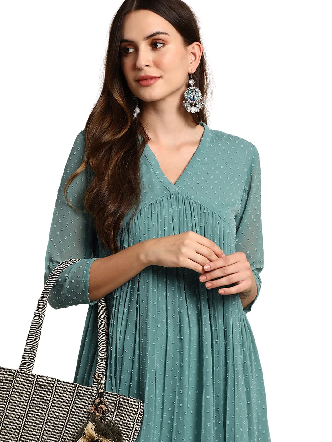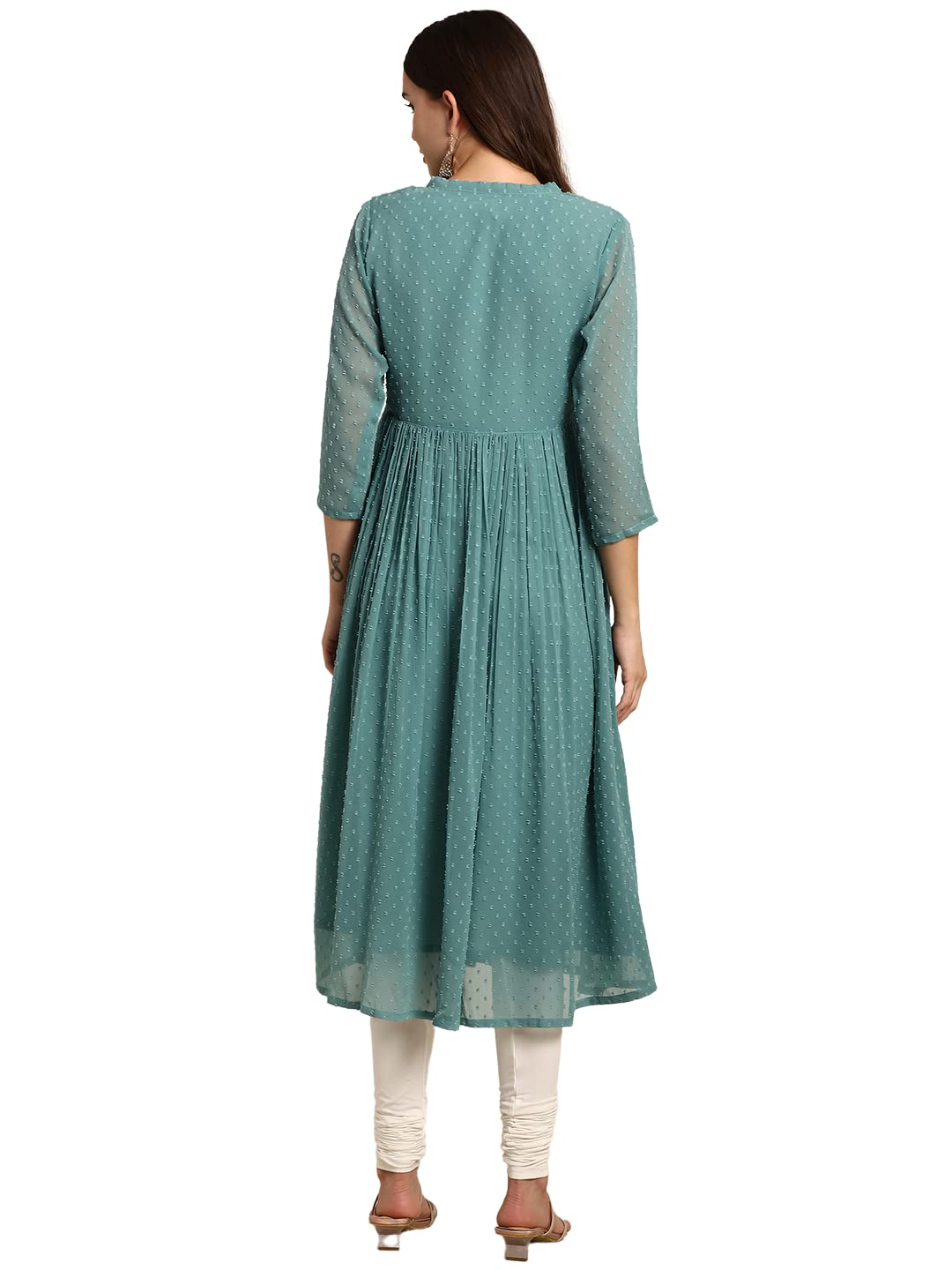 - Style:- Length: 46(inch) | Pattern: Self Design | Occasion: Casual | Type: Flared | Sleeve Type: 3/4 Sleeve(Regular Sleeves) | Color: Green