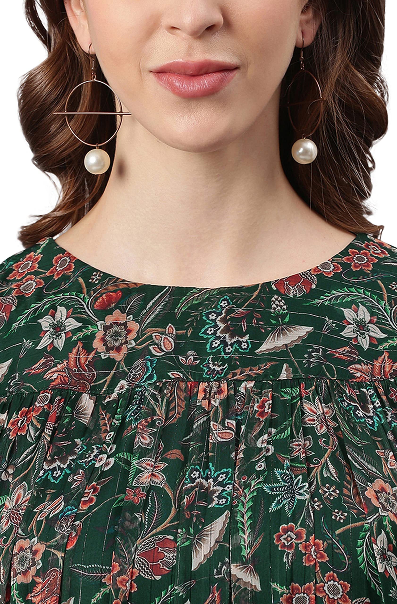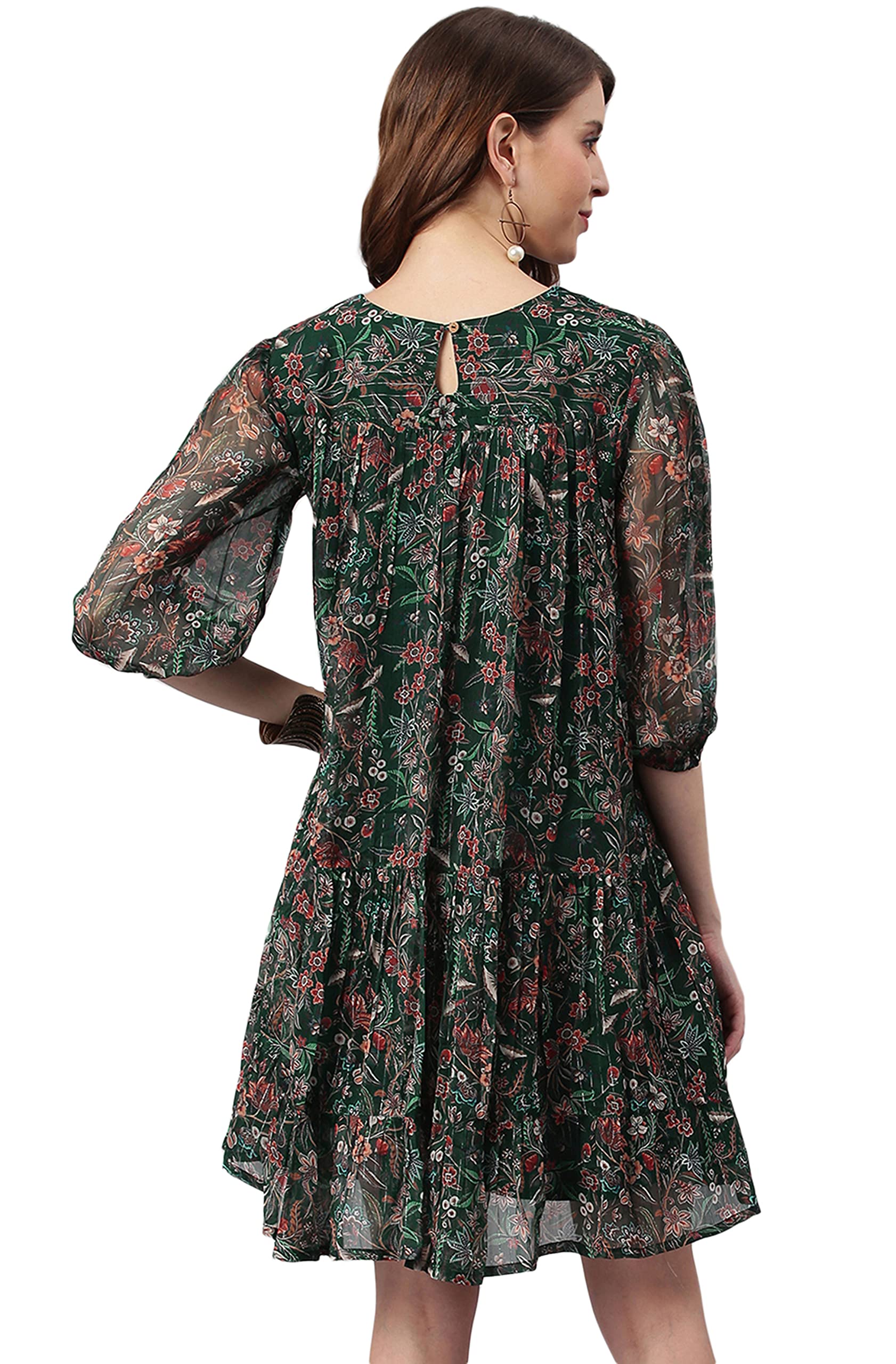 Details: Premium Collection by Janasya. Maintain a trendy style all year long with this stunning Poly georgette dress from Janasya. Create an absolute style high by going with this floral printed green puff sleeve 3 layered gathered dress in combination with a killer shoe and trendy bangles for a perfect brunch look.