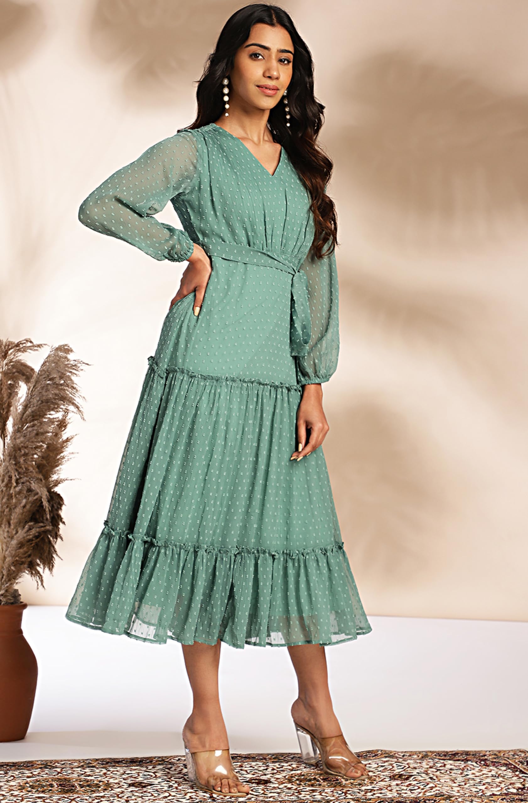Details: Step up your style game with this layered Dress. Crafted from dobby chiffon in a serene sage hue, this floor-length dress features a V-neck, full bell sleeves, and a flared fit. Ideal for casual or evening occasions, the dress offers timeless charm with its dobby detailing. Pair it with block heels. Maintain the fabric with gentle handwashing.