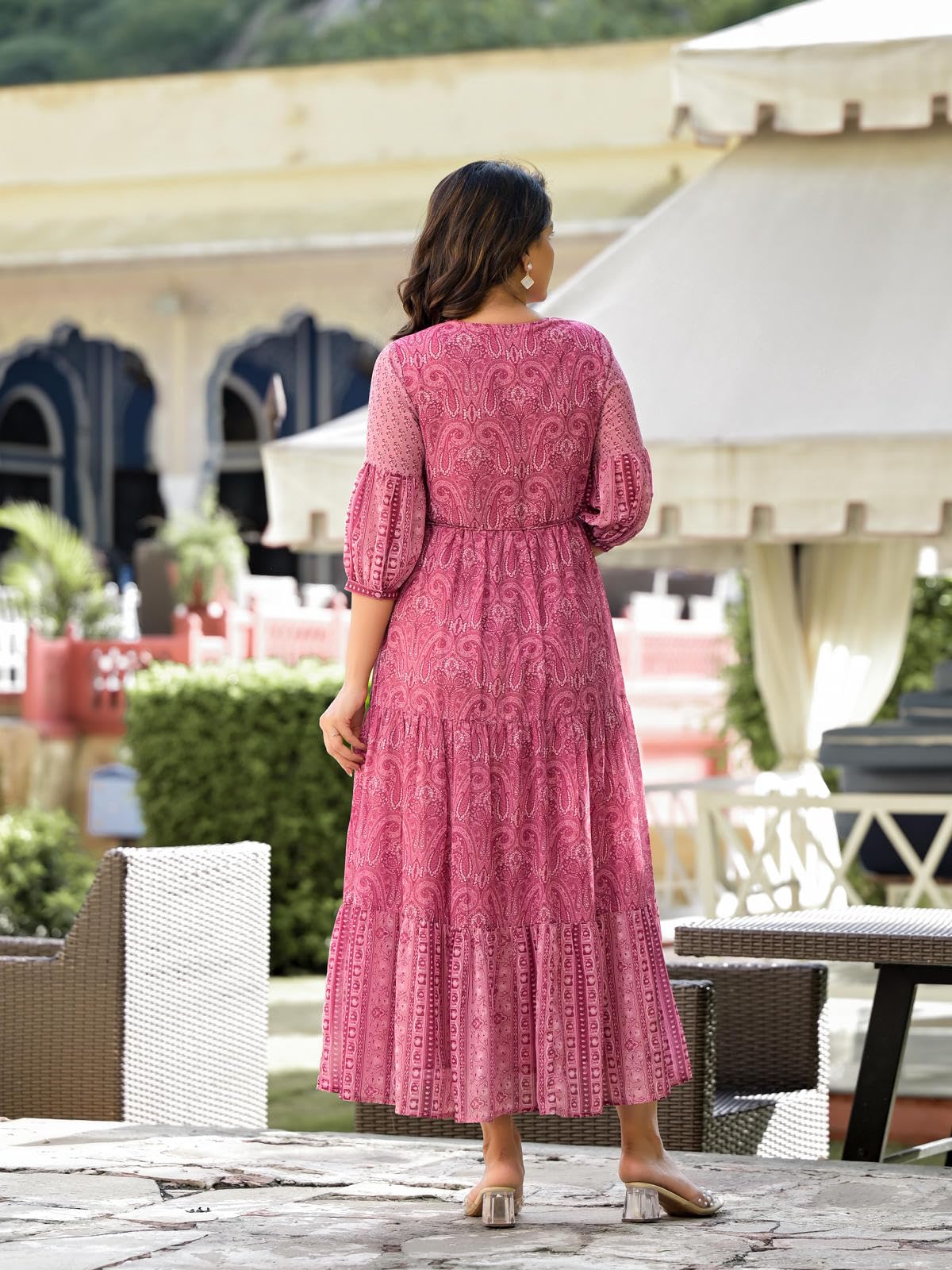 Juniper Onion Pink Ethnic Motif Printed Georgette Gathers Maxi Dress with Sequins & Doris