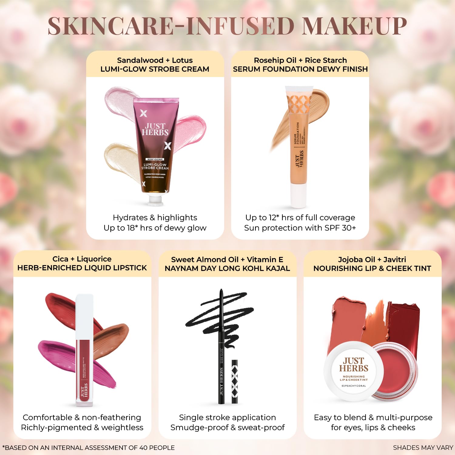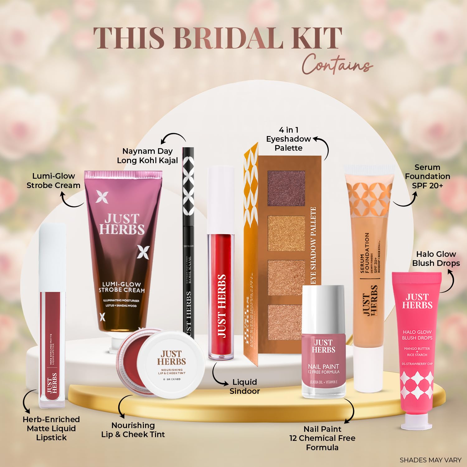Just Herbs Wedding Kit Glam Essentials with Matte Lipstick | Lip & Cheek Tint | Strobe Cream | Kajal | Sindoor | Eyeshadow Palette | Nail Paint | Serum Foundation | Blush Drops All in One Makeup Gifting Kit for Women (Pack of 9)