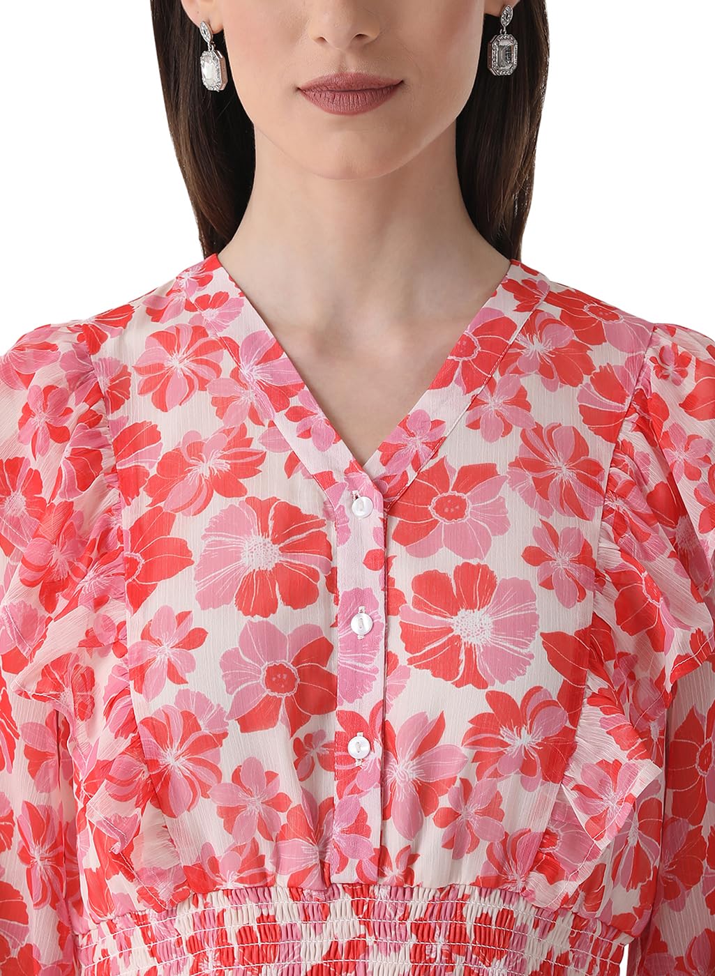 FLORAL PRINTED TIERED MINI DRESS WITH RUFFLE DETAIL AND SMOCKING. PAIR IT WITH WHITE STRAPPY HEELS AND A SLING BAG FOR A TRENDY SUMMER DAY OUT.