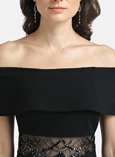 Details: Stretchable Off Shoulder Mini Dress With Overlay Detail And Hand Embellishment At Waist. Style It With Pointy Heels And A Sling Bag For A Romantic Dinner Date.