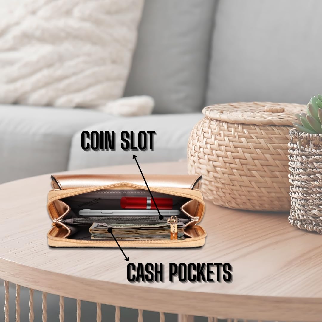 - Secure Zippered Pockets: A 270-degree zip-around pocket with a smooth golden, metal zipper on the rear provides easy access, while inside, a robust polyester-lined, brand-inscribed zippered coin pocket divides the 3-quarter opening zippered compartment.