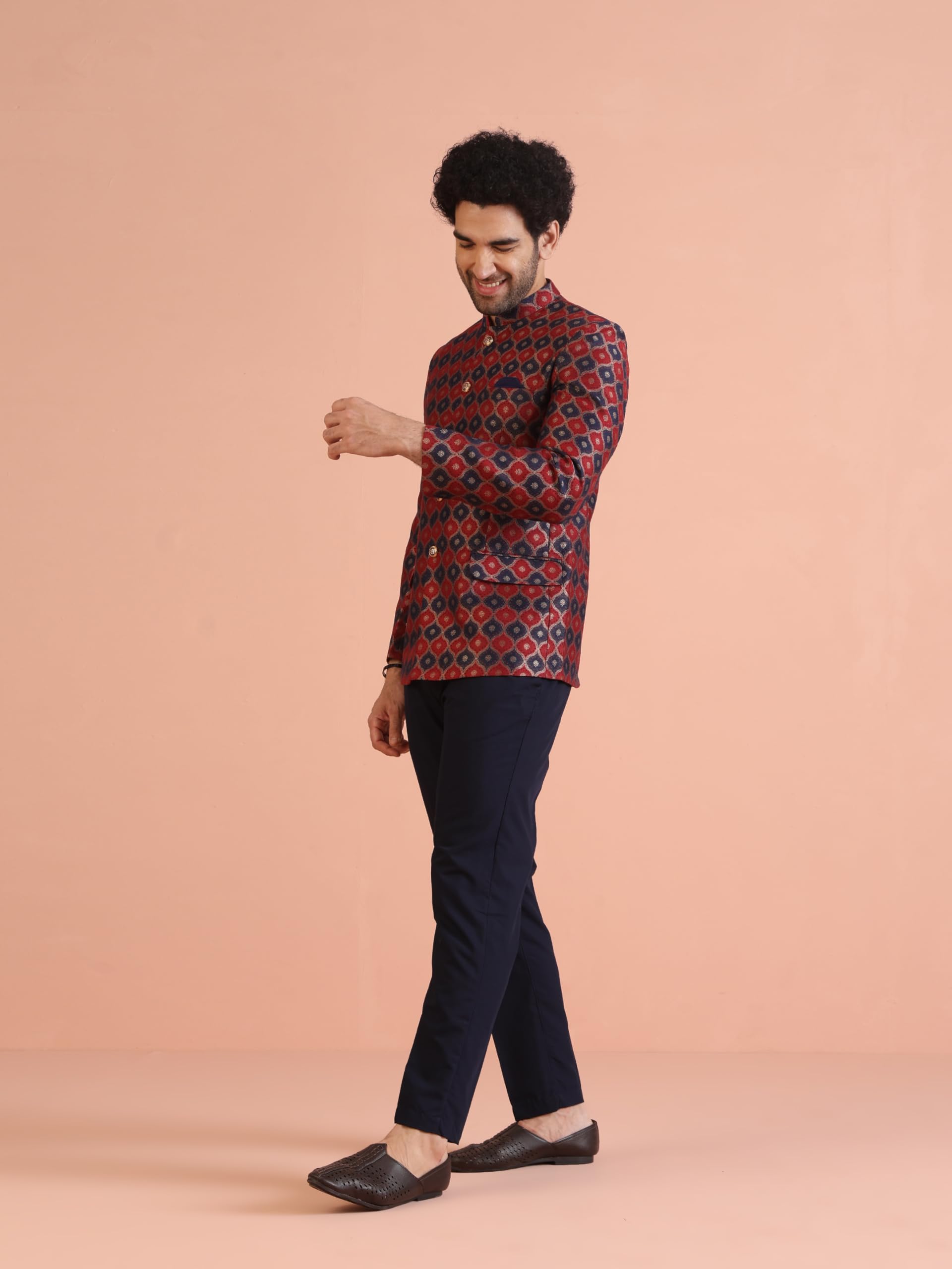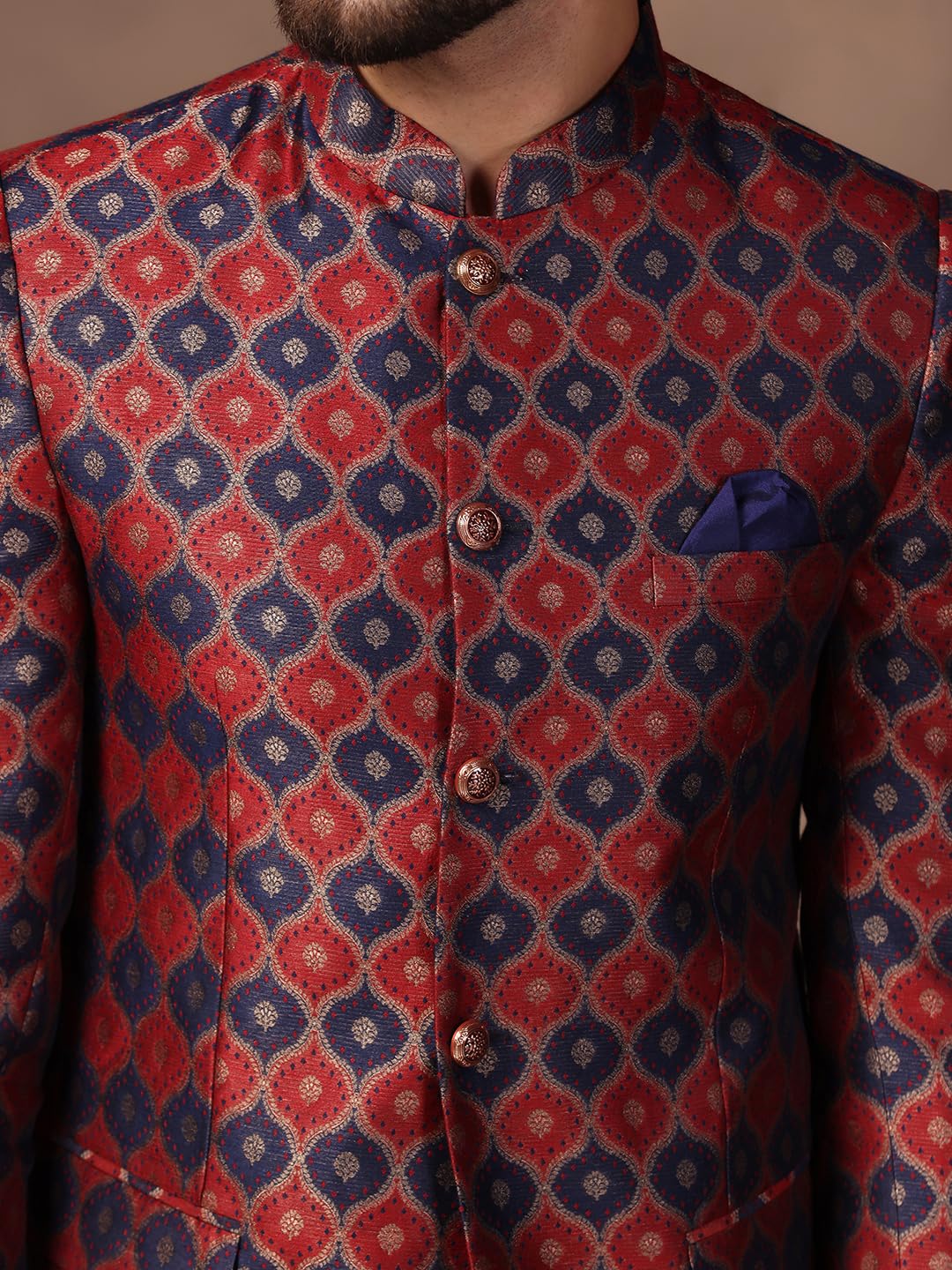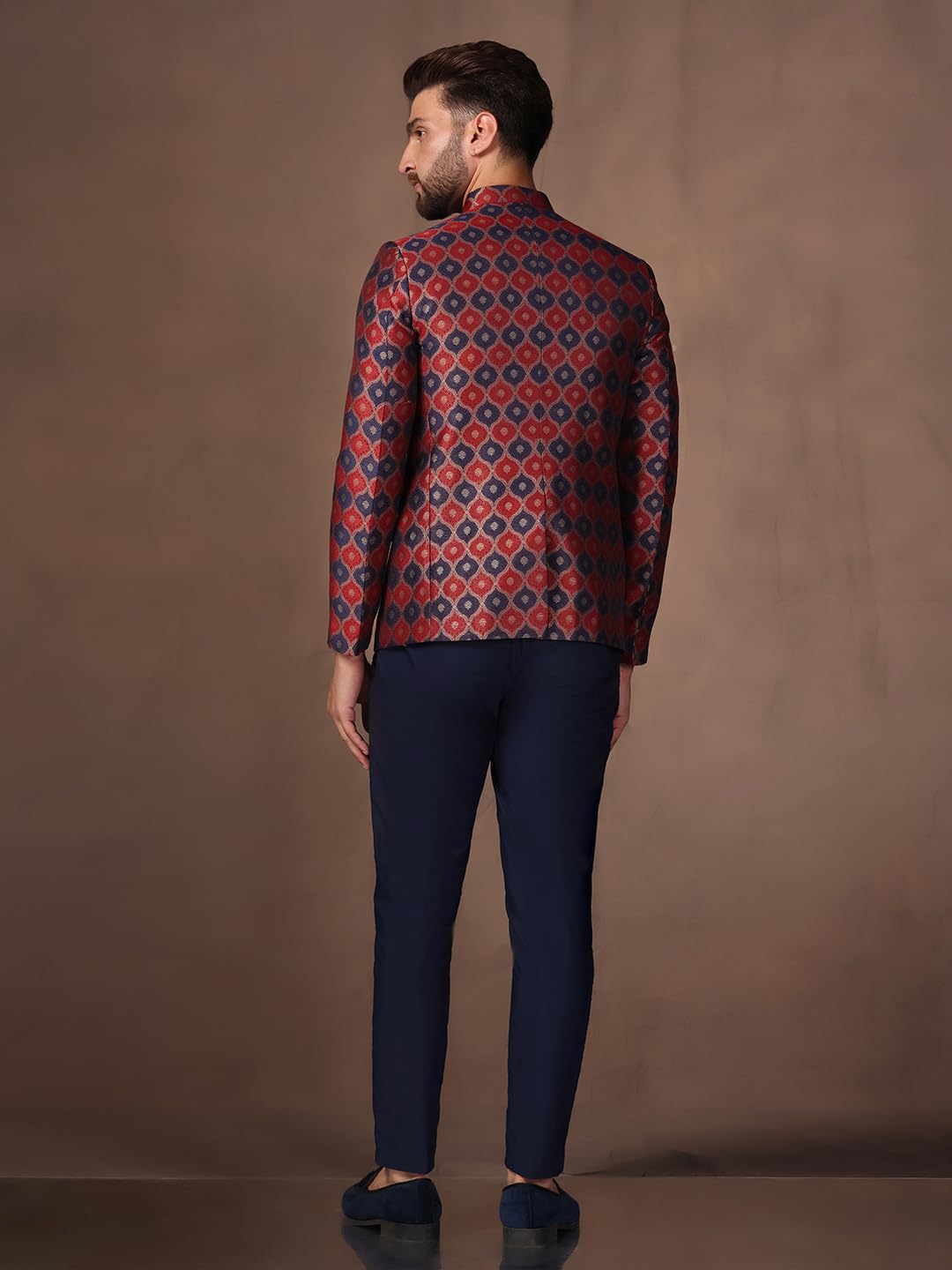KISAH Mens Jodhpuri Bandhgala Trouser Set Silk Blend Jacquard, Ethnic Wear for Men, Maroon, 40