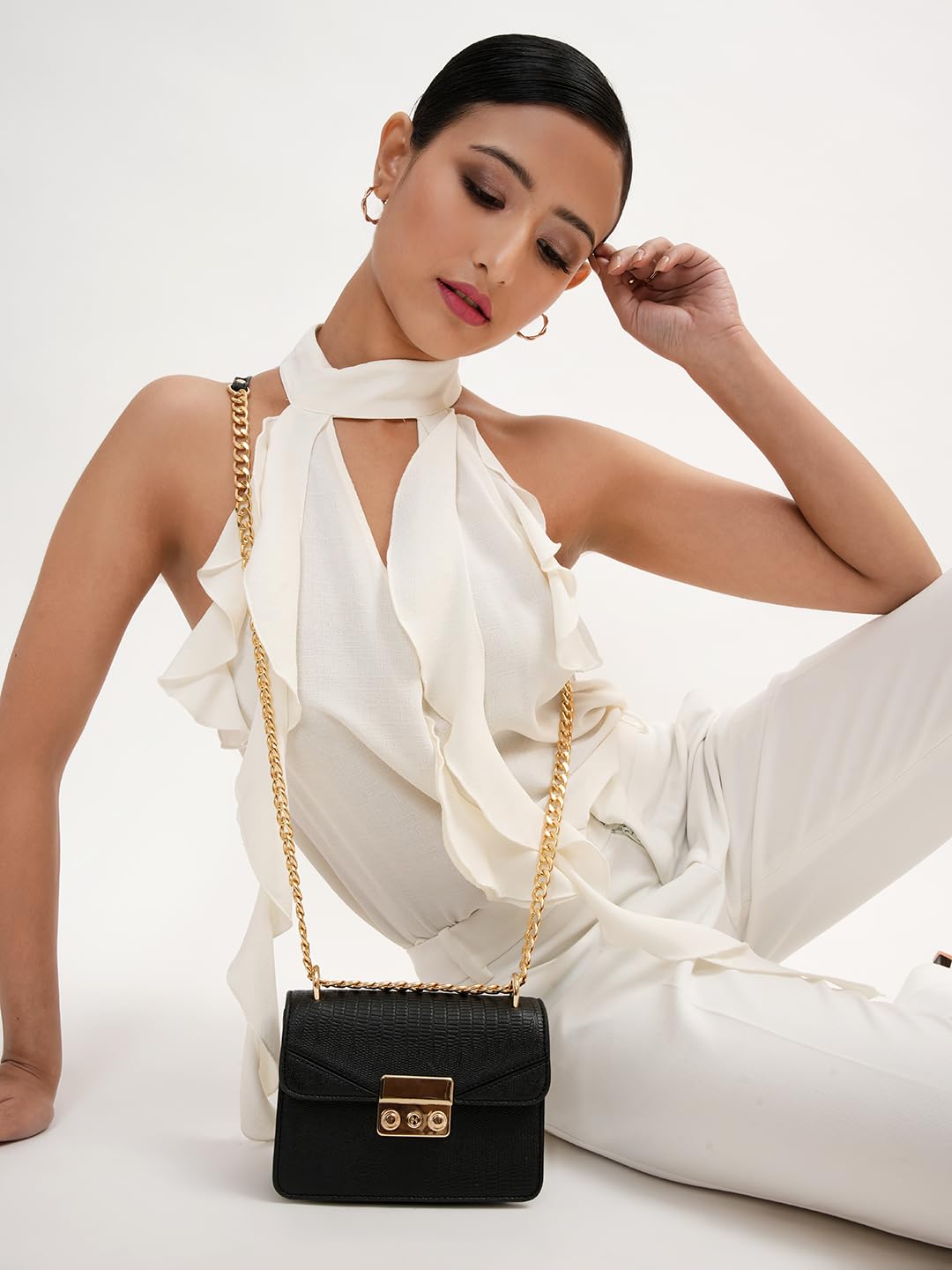 Details: Elevate your outdoor style with this chic women's mini sling bag from KLEIO. The captivating flap closure adds allure, while the premium embossed leatherette ensures durability. With a light-weight and sleek design, this crossbody bag, perfect for parties, features a chain strap for both comfort and an elegant aesthetic.