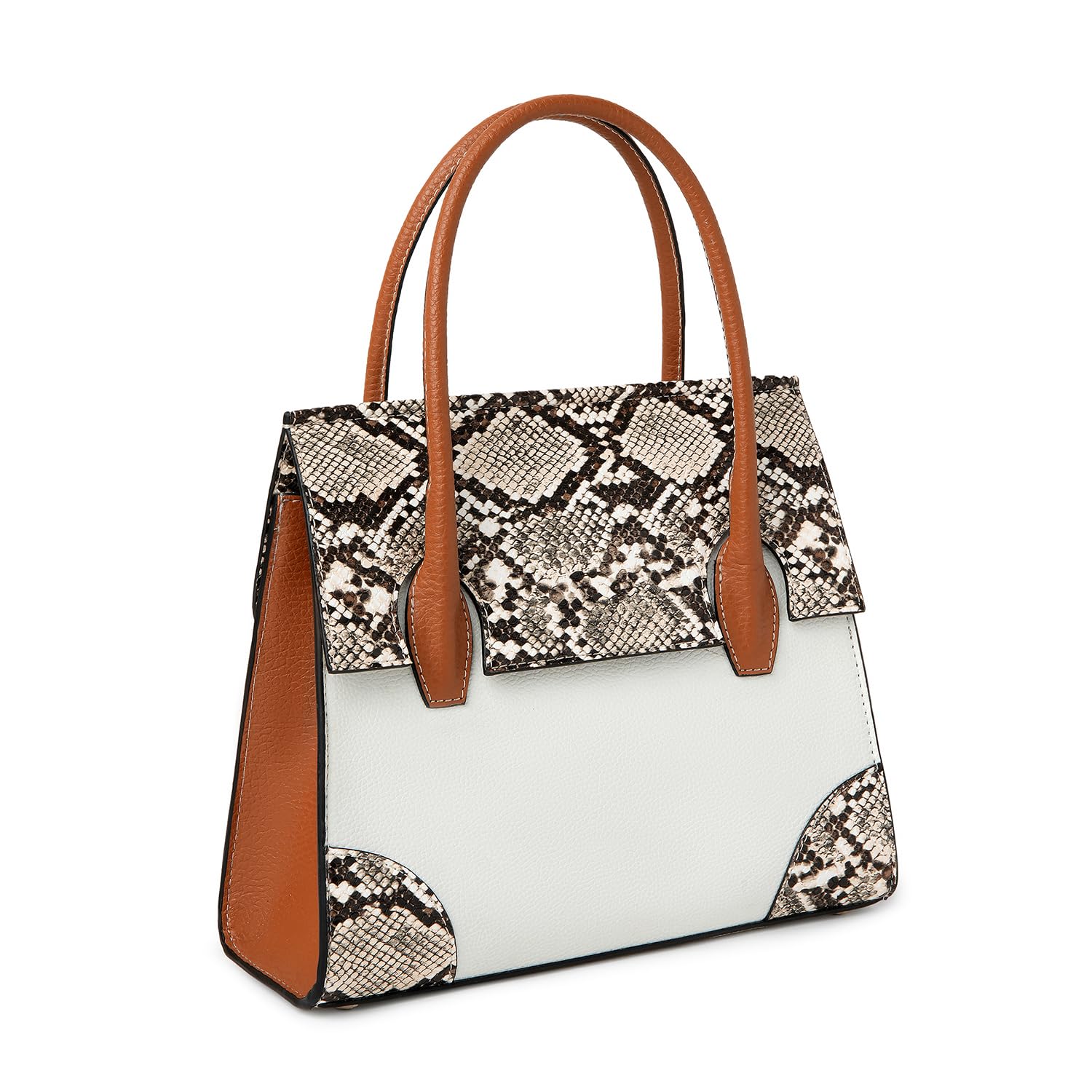 Details: Elevate your style with our Vegan Leather Snake Print Mini Satchel Handbag in a stunning white color, sealed by a sleek chrome-colored magnet lock. The captivating snake print on the front flap exudes modern sophistication. This mini satchel is thoughtfully designed to accommodate your daily essentials such as lipstick, pocket diary, pens, sunglasses, and a three-fold wallet. Ideal for daily wear, its versatile charm makes it a perfect match for any outfit, adding an extra touch of glamour to your elegance.