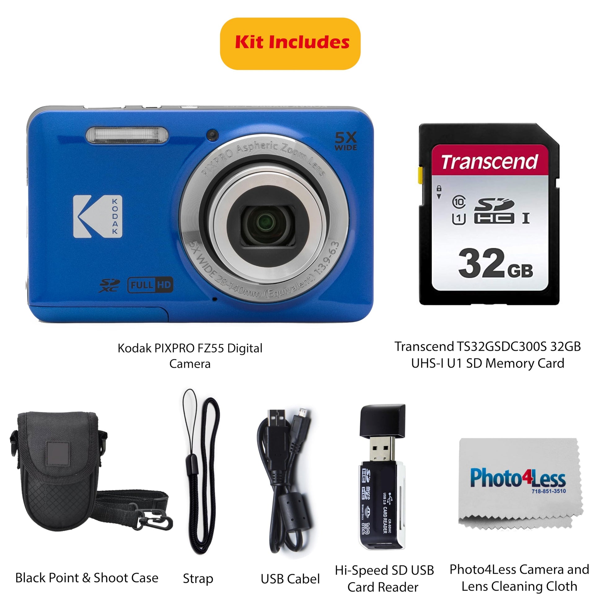 - BUNDLE INCLUDES: Everything you need to start snapping right out of the box, including KODAK PIXPRO FZ55 (Red) , 32GB SD memory card, Camera case for protection, High-speed USB SD card reader, Photo4Less camera and lens cleaning cloth.