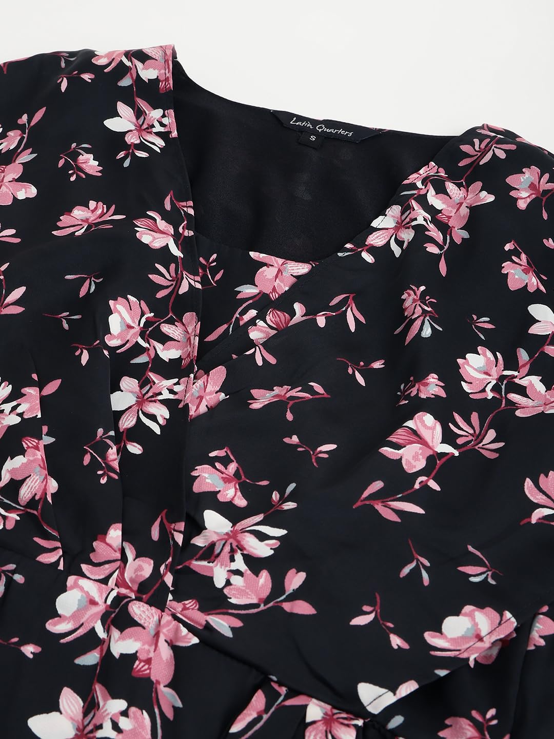 Latin Quarters Women Black Cap Sleeve V-Neck Printed Top_XXL