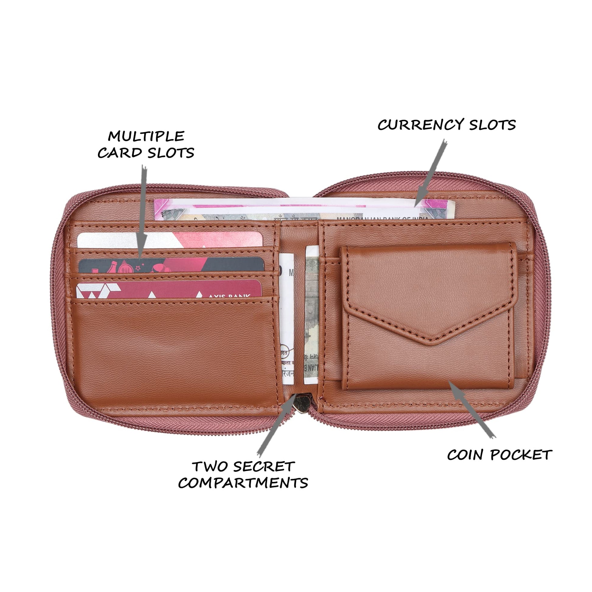 - This Zip around wallet is made of synthetic leather and has 4 pockets for cards, 1 ID Card Slot, 1 large main compartment for currency notes.