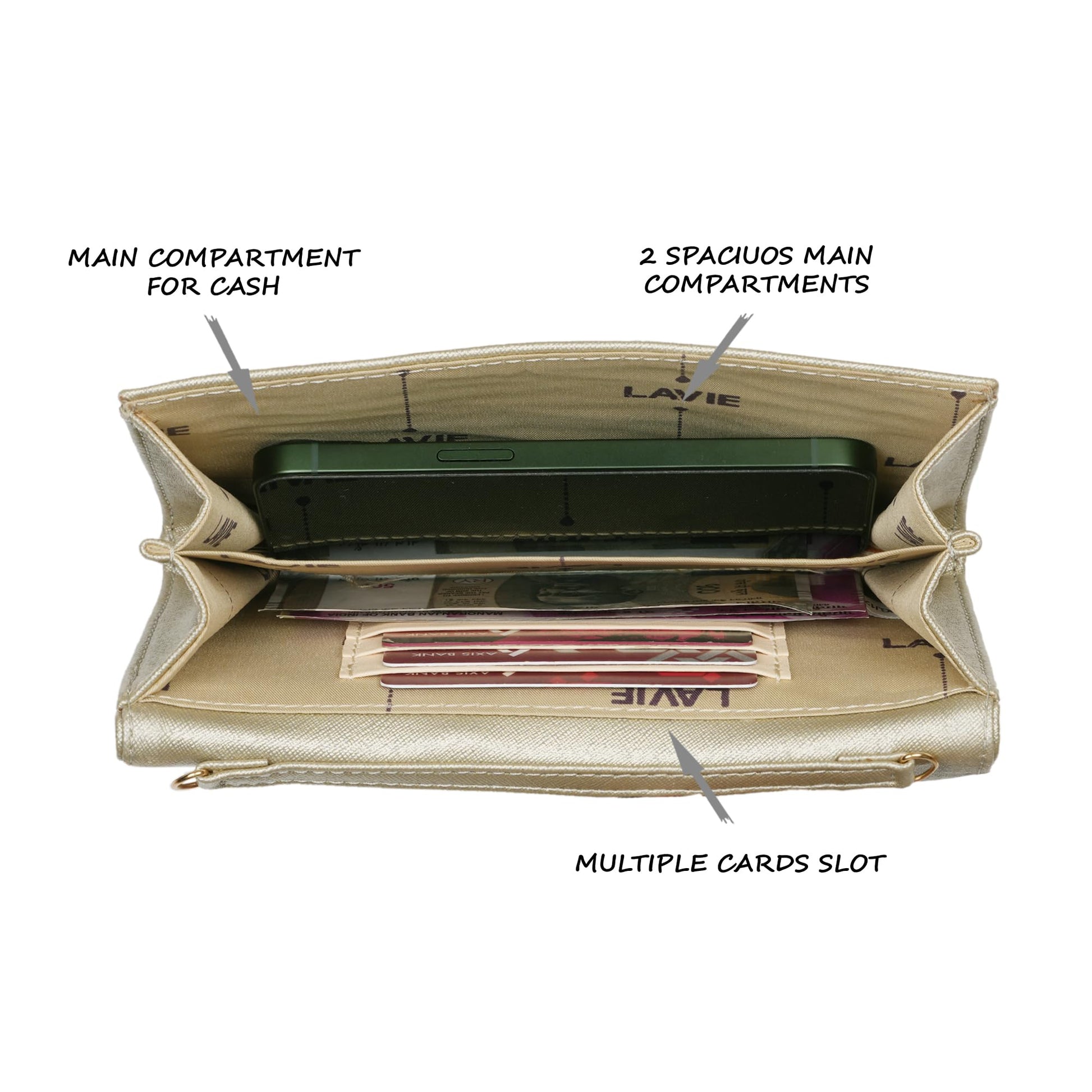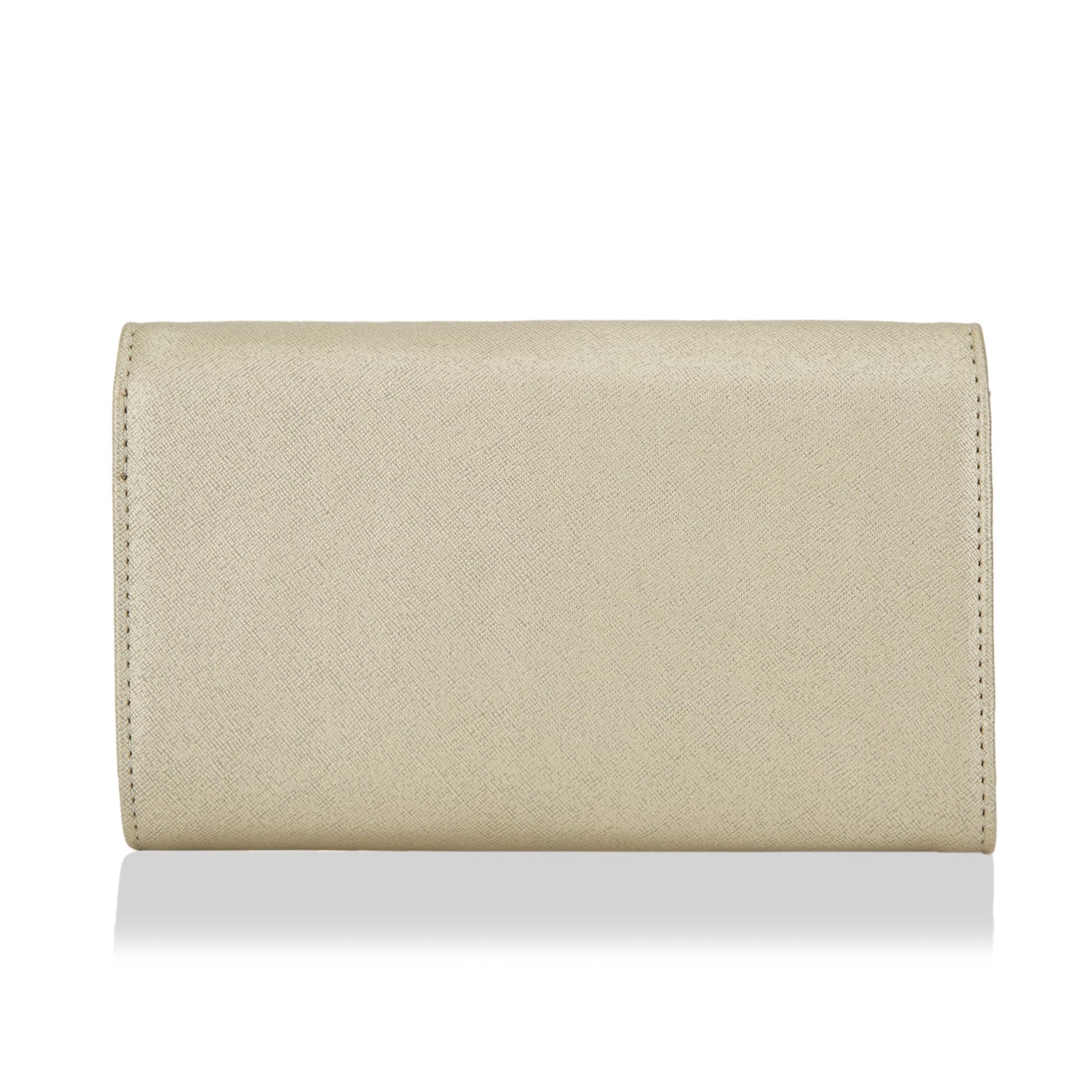 - The Lavie branded lining and clasp closure not only ensure the smooth opening and closing of the clutch but also add a touch of sophistication. The delicate gold metal-looking finish adds an elegant and luxurious element to the overall design, making it a standout accessory