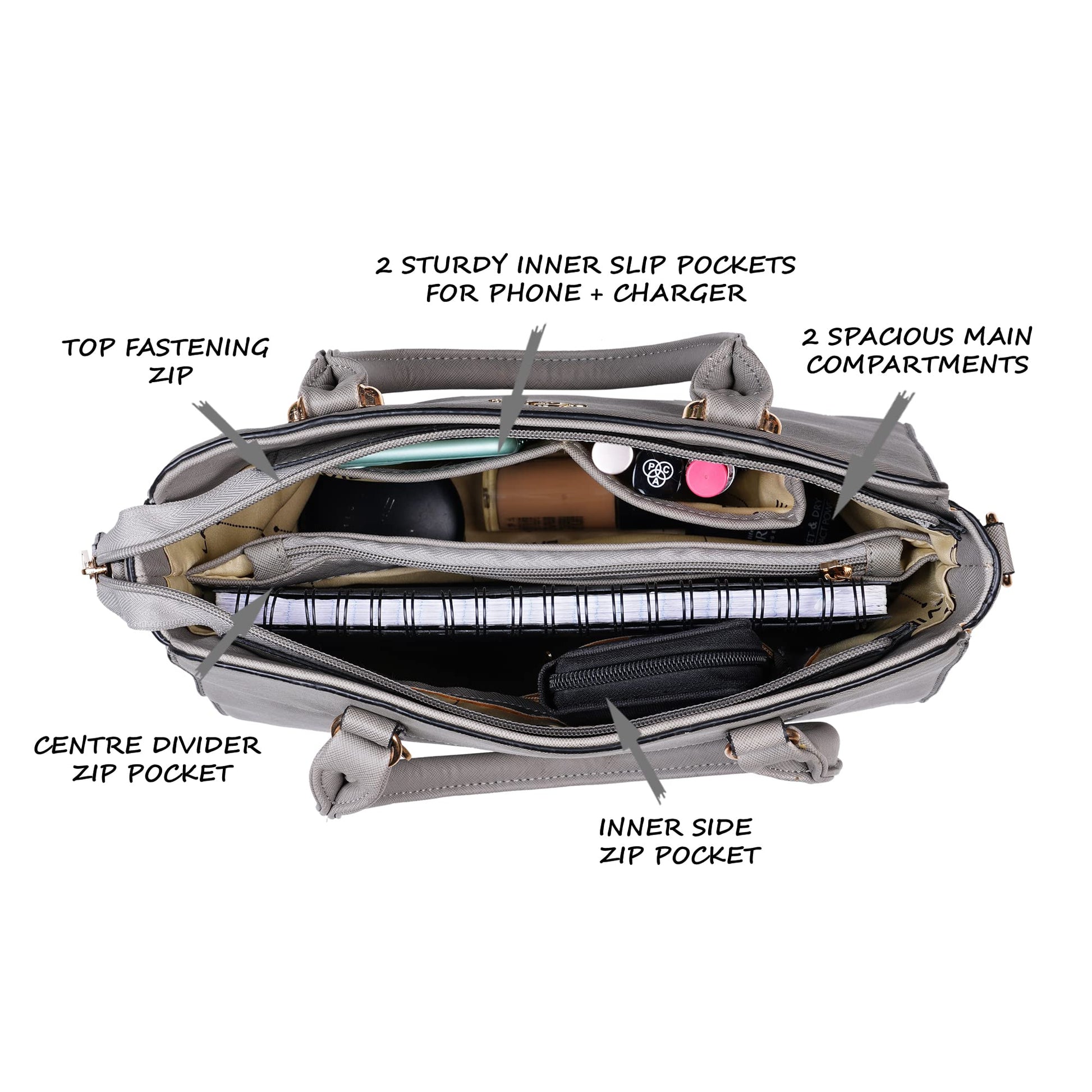 - Ushawu hand bag has a top zip closure for safety and comfort. It is a spacious hand bag, the interior has 2 compartments, divided by an inner zip storage, 2 slip pockets alongside 1 zip pocket, providing plenty of storage space for keeping phone, portable charger, keys, hairbrush, wallet, sunglasses, sanitizer etc. It has dual round cushioned top handles and an adjustable sling belt for multipurpose use.