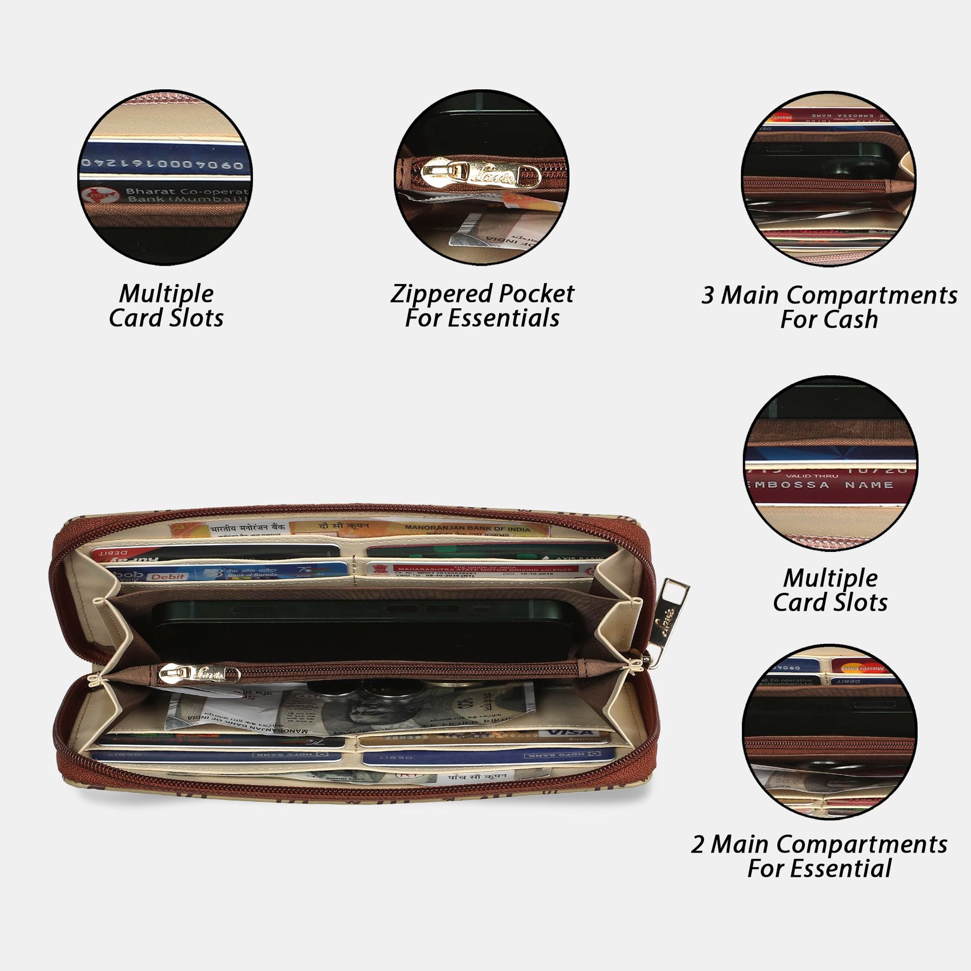 - This wallet has 12 card holders, 3 compartments, has a zip closure. Pocket can hold multiple cards, coins, change. Conveniently store your credit cards, ID card, bills, cell phone, so it's easy to carry all your important belongings and meet your daily needs.