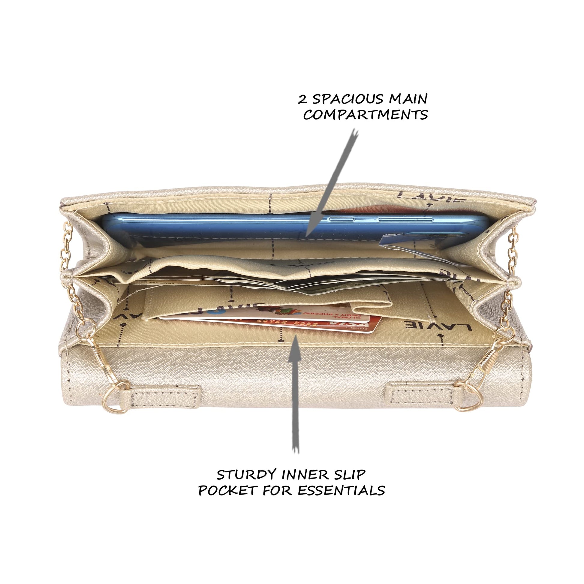 - All Lavie evening bag comes up with Lavie branded lining and clasp closure which can be opened and closed smoothly, built-in pockets,Long Shoulder detachable Metal Chain, large storage capacity which easily carries your basic essentials like a mobile phone, cards, cash, car keys, small wallet, mirror, lipstick and some makeups.