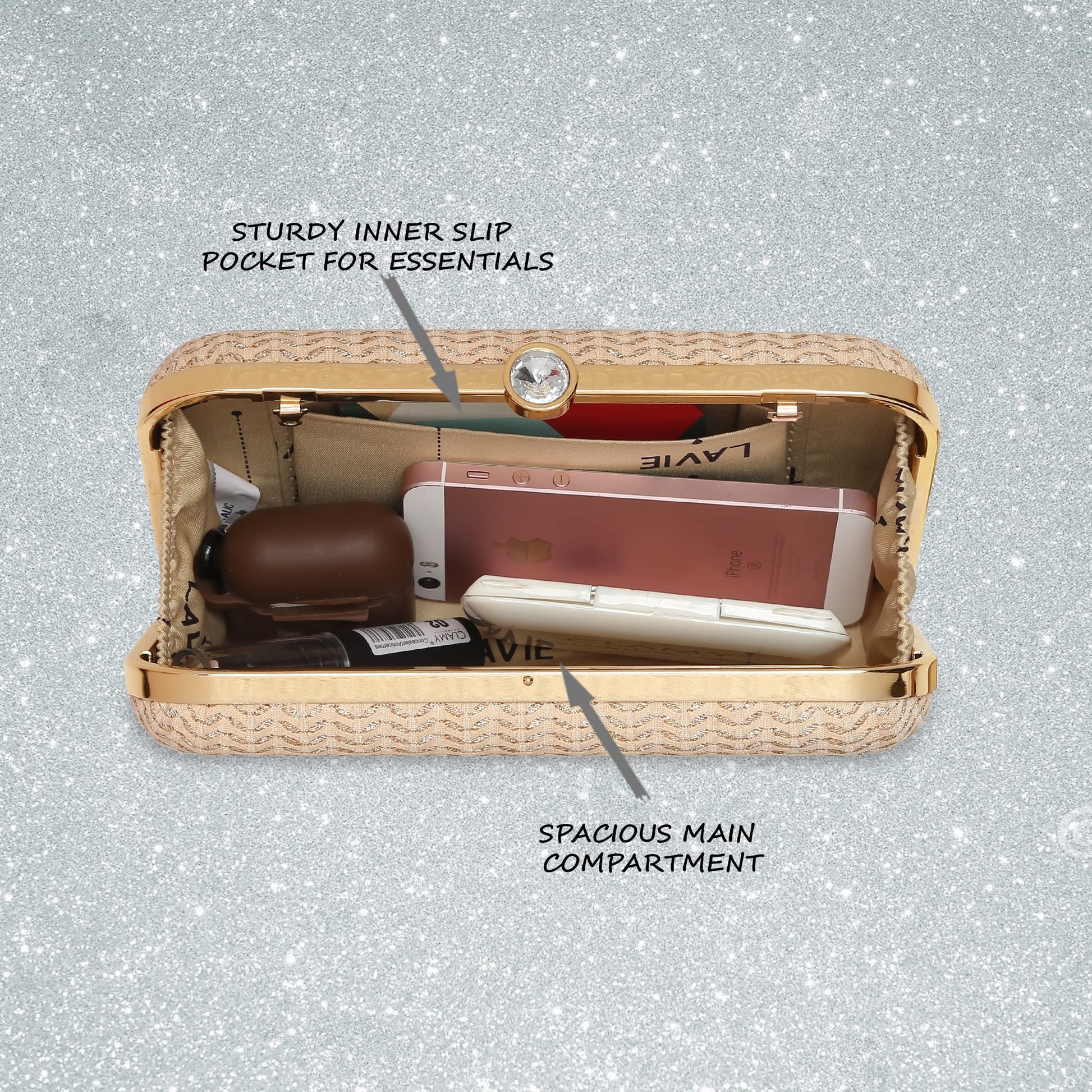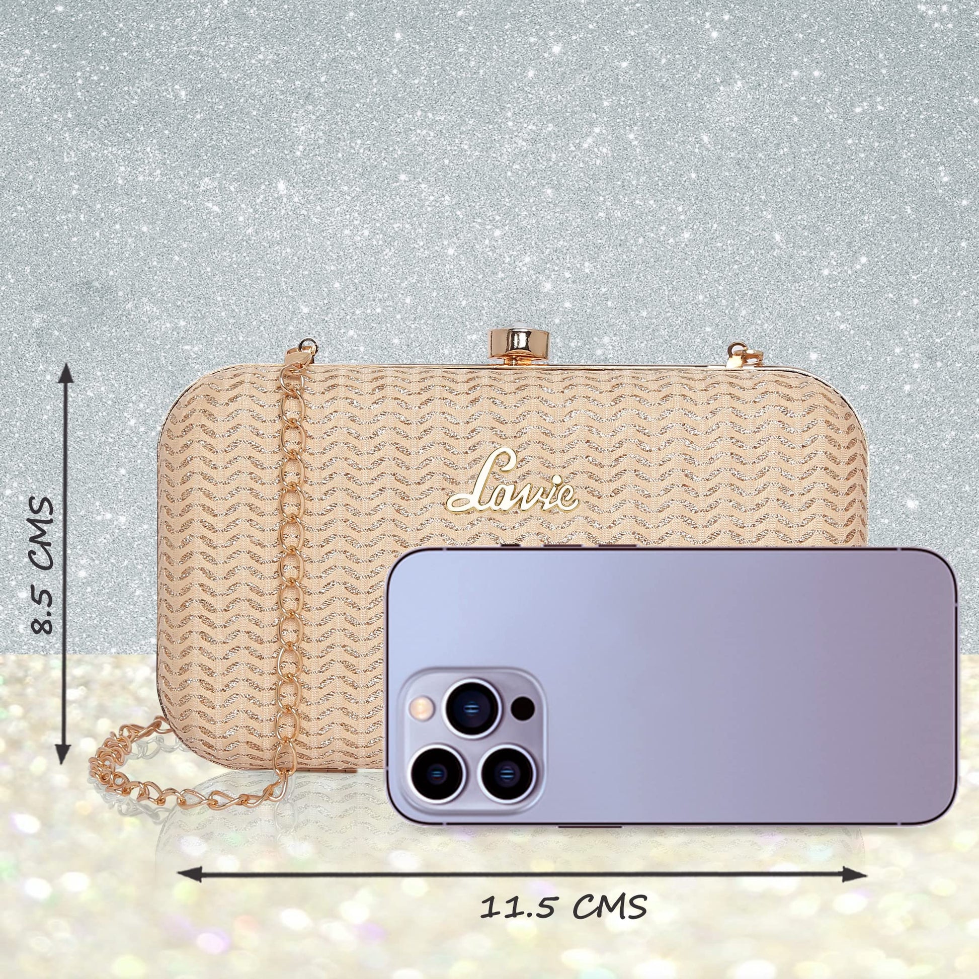 - All Lavie handbag and clutches comes up with Lavie branded lining and clasp closure which can be opened and closed smoothly, built-in pockets,Long Shoulder detachable Metal Chain, large storage capacity which easily carries your basic essentials like a mobile phone, cards, cash, car keys, small wallet, mirror, lipstick and some makeups.