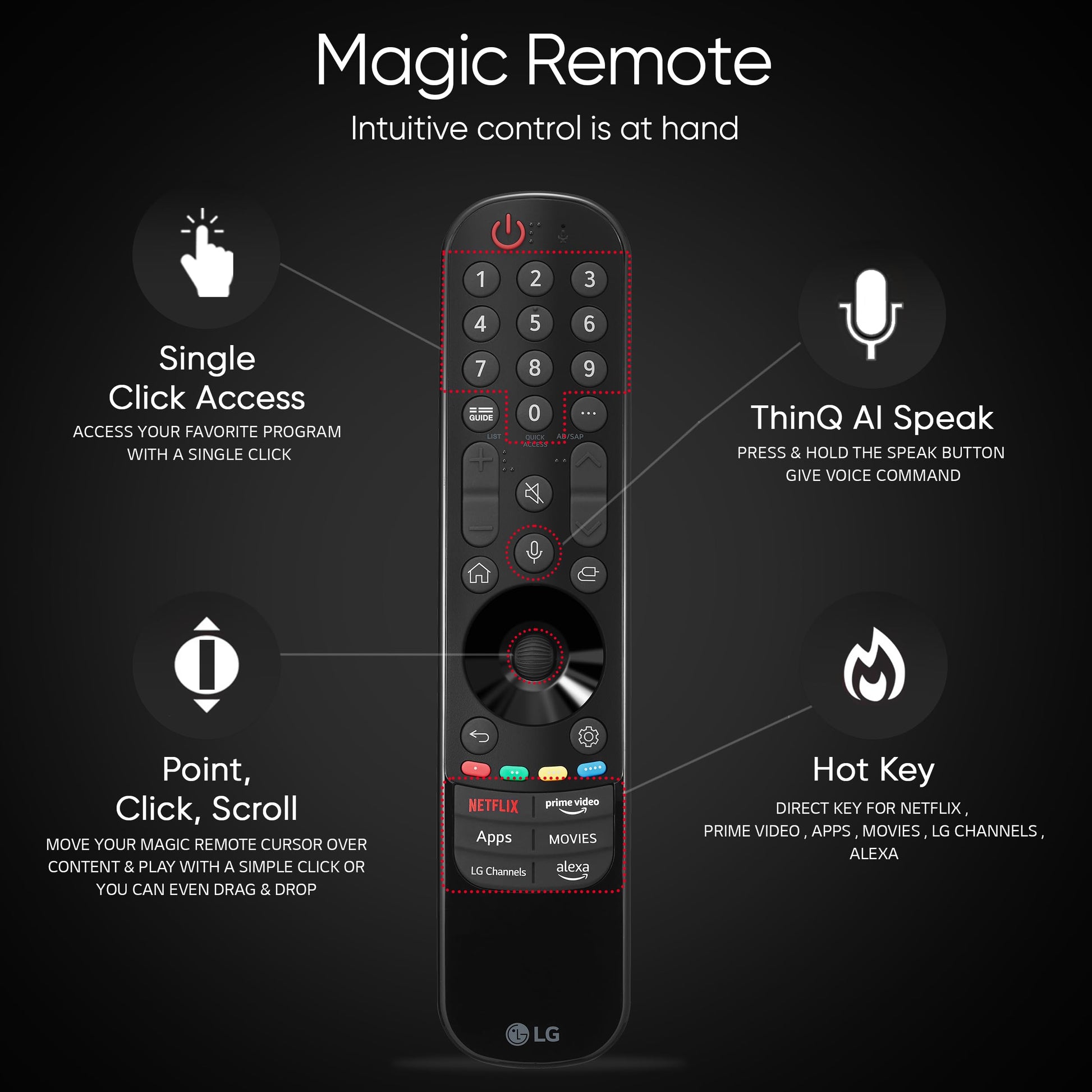 - Smart TV Features: α8 AI Processor | Web OS Operating System | Wi-Fi | Magic Remote | Full Web Browser | Built In Chromecast | Game Optimizer | AI Functions | Dynamic Tone Mapping Pro | HDR 10 | 2 GB RAM | 16 GB ROM | Supported Apps: Prime Video, Netflix, Jio Hotstar, Sony Liv, Zee5, Apple TV and more | Energy Rating: 3 Star | Annual Energy Consumption: 184.00 kWh/Year