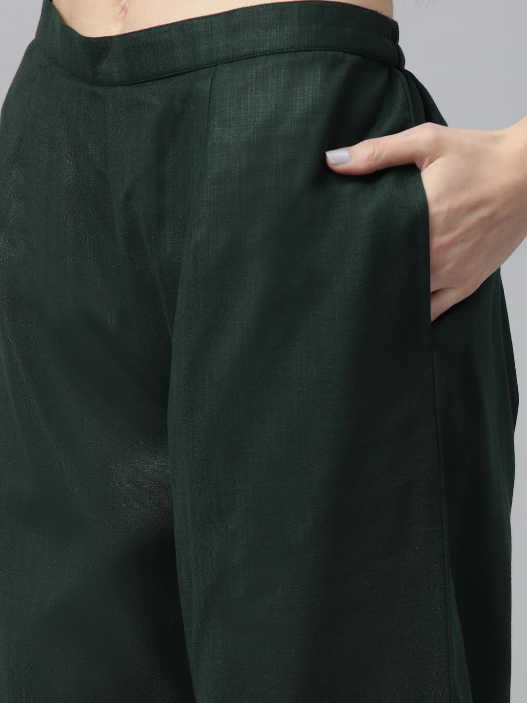 Our 3-piece green solid-tone cotton suit set features a straight-fit kurta with a notched neckline and three-quarter sleeves. Complemented with palazzos with a partially elasticated waistband and roomy pockets, and a dupatta. Adorned with Gota Patti detailing and handmade fabric buttons, this style is perfect for elevated everyday wear.