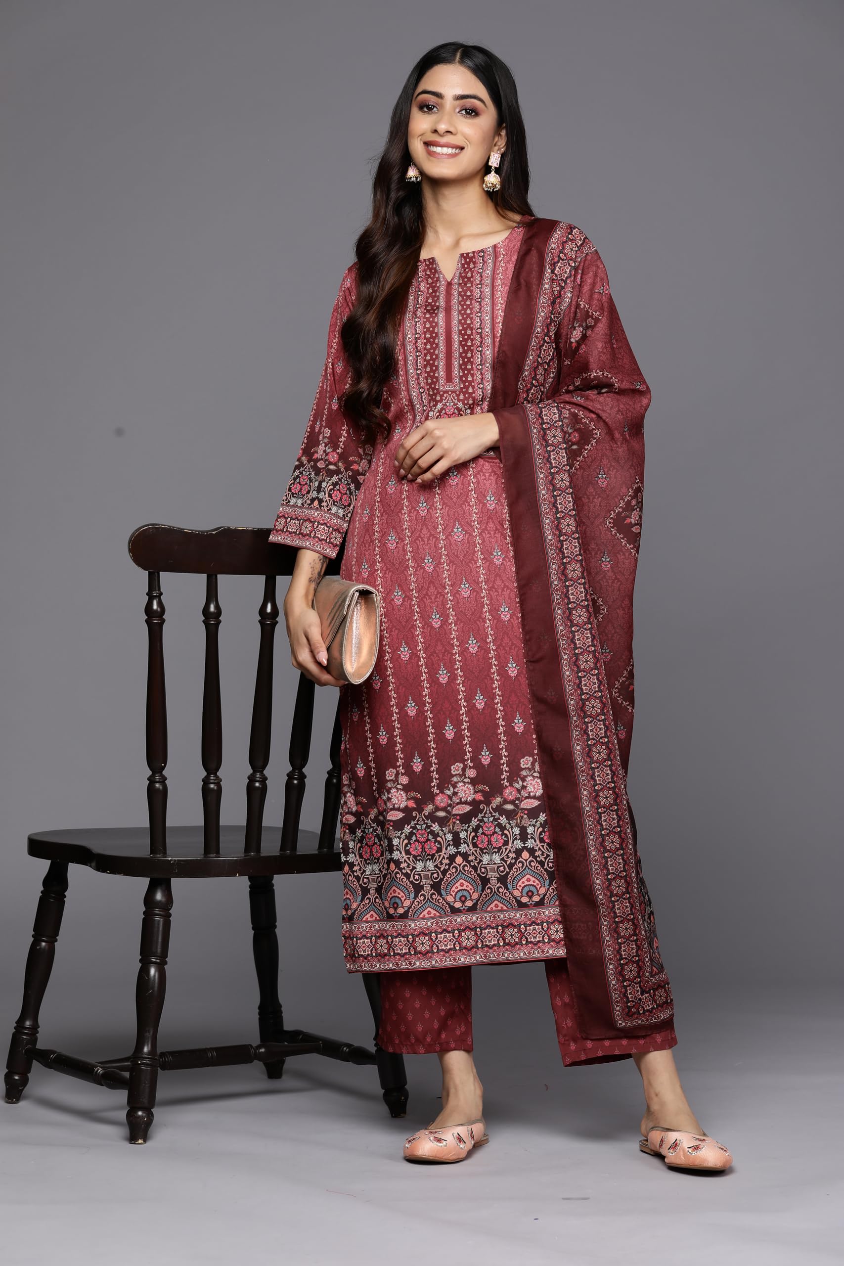 Our 3-piece maroon red floral print crepe suit set features a straight-fit kurta with a notched neckline, three-quarter sleeves, and a statement yoke. Complemented with straight trouser pants with a partially elasticated waistband and roomy pockets, and a matching dupatta. This elegant style is perfect for casual outings.