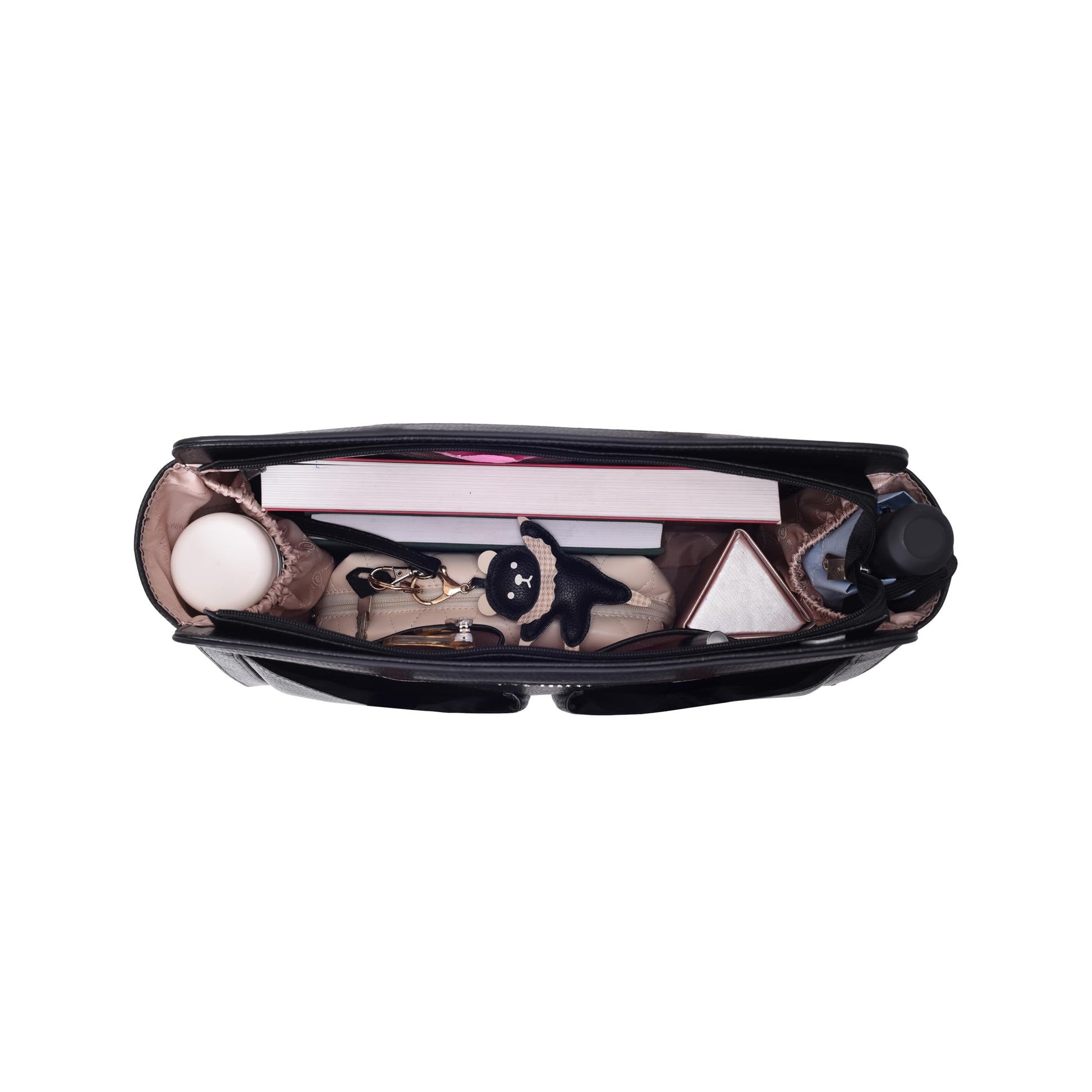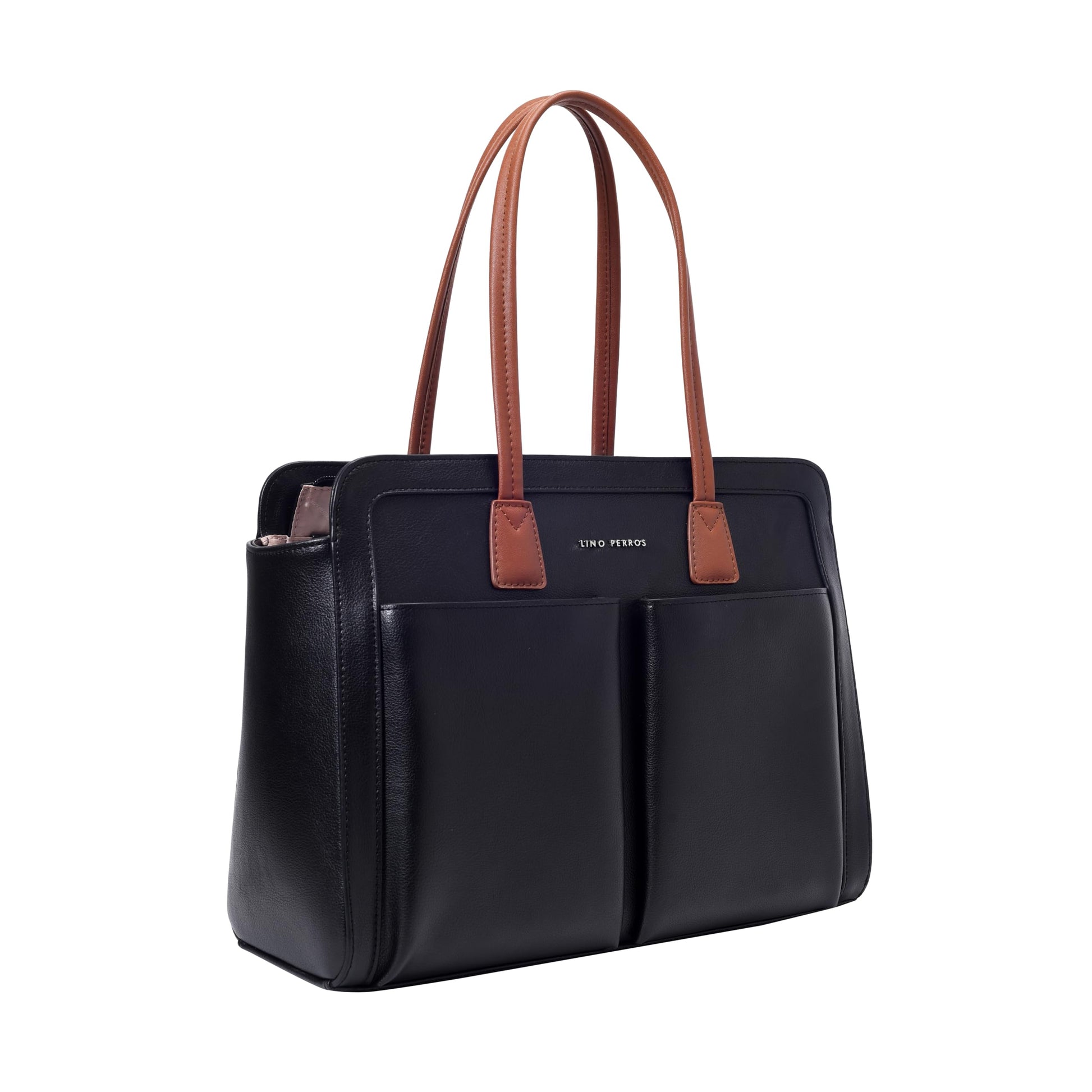 A refined black bag with elegant brown handles, featuring two front pockets for easy access. Perfectly sized for daily essentials, it combines style and functionality for modern living.