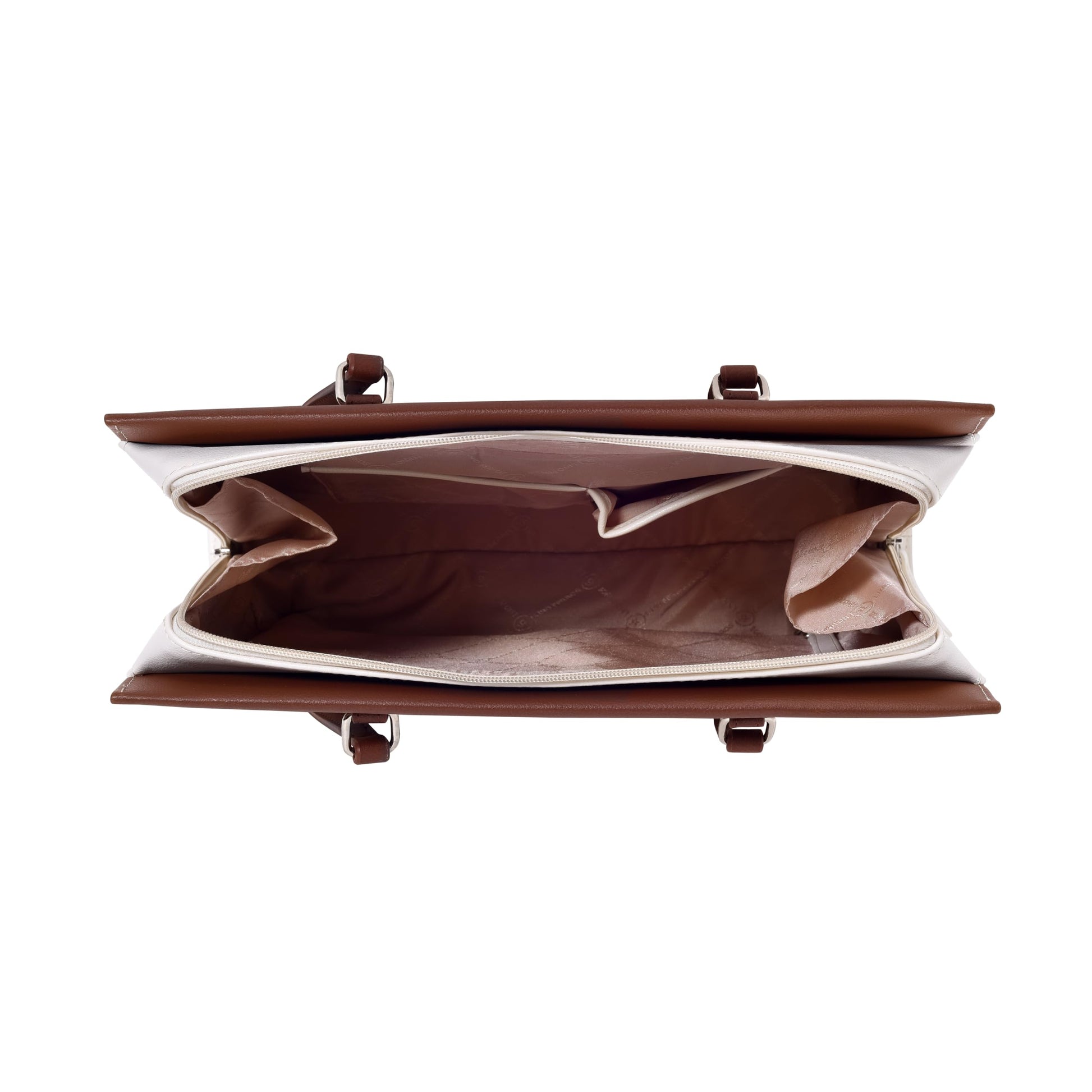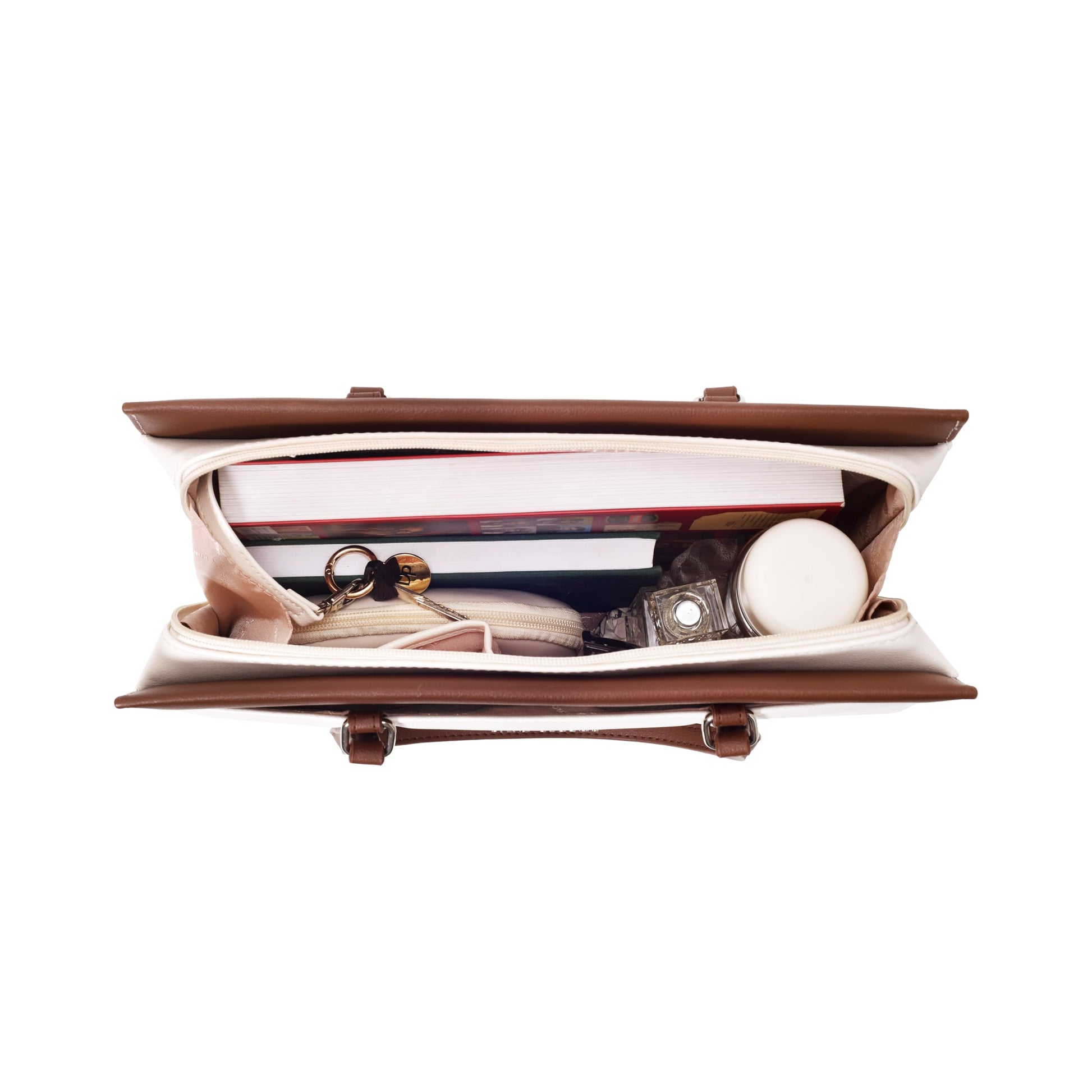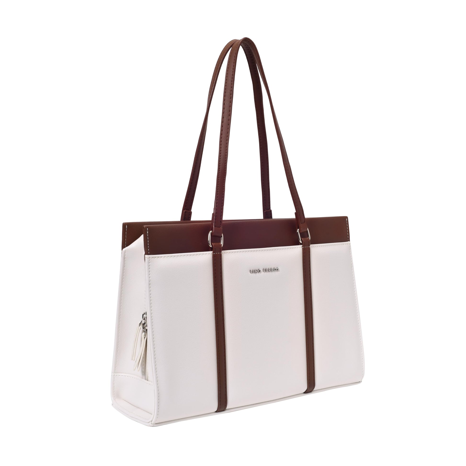 This tote bag has a structured design with a chic front panel detail. It offers ample space for essentials and features sturdy straps for easy carrying, making it a versatile option for everyday use.