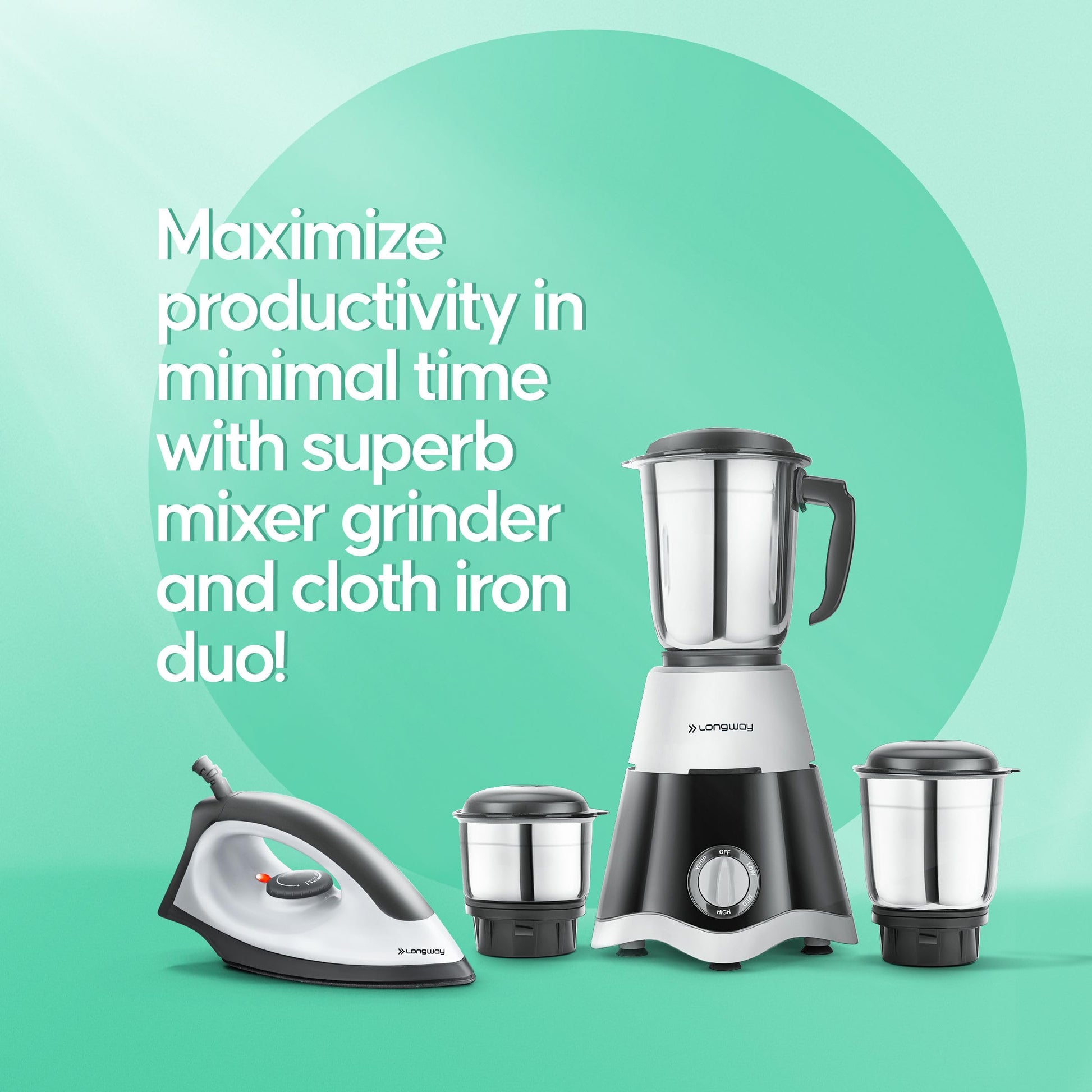 Longway Supreme Dlx Mixer Grinder with 3 Jars for Mixing, Grinding with Kwid 1100W Dry Iron | 2 Years Warranty (Gray & Black, 700 W)