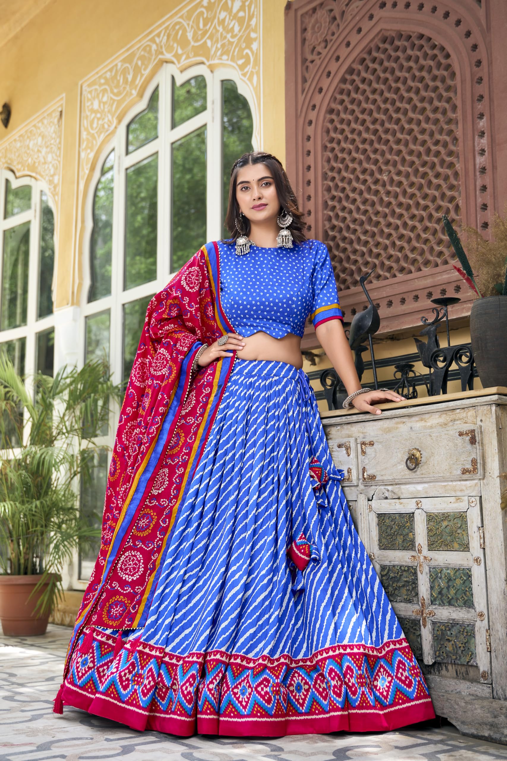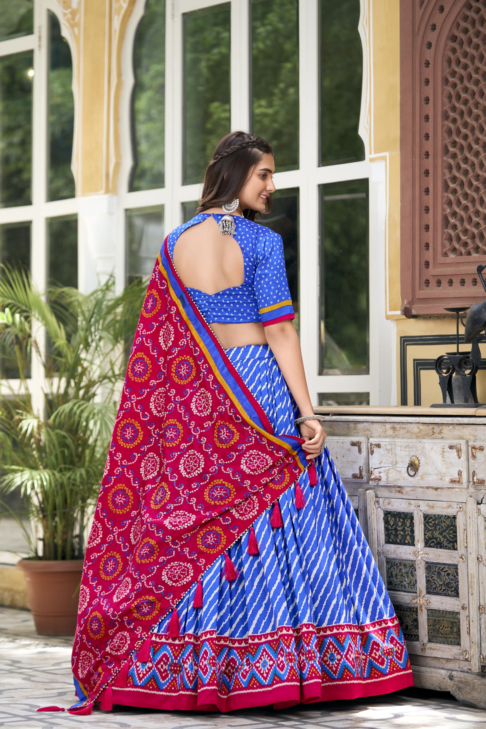 - Lehenga(Stitched)Lehenga Fabric : Tussar Silk, Lehenga Work : Leheriya With Patola Print Border, Lehenga Waist : SUPPORTED UP TO 42, Lehenga Closer : Drawstring With Heavy Tassels and Zip, Stitching : Stitched With Canvas and attached with Can Can, Length : 42, Flair : 3.80 Meter, Inner : Micro Cotton