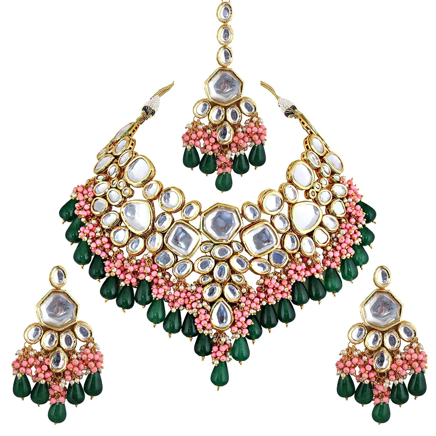 This stunning Bridal Necklace set from LUCKY JEWELLERY will certainly delight all the lovely Indian girls, who are ready to get married. Admirable gift for your Mother, Sister, Wife and Girlfriend. Ideal for Party & wearable on Birthday, Marriage, Engagement, Shadi & any other Occasion. This Necklace set includes matching Earring, Tika & One Necklace Set. Further, this set is studded with finest quality of coloured and white stones that gives render amazing look. (Dimension:-Neck Piece Length- 13 cm, Neck Piece Width- 5 cm, Earring Length- 26.7 cm, Earring Width-11 cm, Maang Tikka Length- 11 cm, Maang Tikka Width-4 cm)